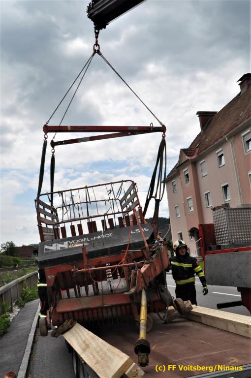 Mit dem WLF-Kran der FF Voitsberg wurde das landwirtschaftliche Gerät geborgen und zu einem Abstellplatz transportiert. Die FF Voitsberg richtete während der Bergungsarbeiten eine Umleitung über die Bahnhofstraße ein und reinigte die Straße von herumliegenden Wrackteilen.