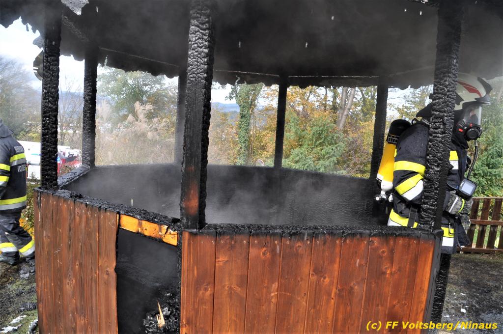 Durch den raschen und gezielten Einsatz der FF Voitsberg konnte das Wohnhaus, bei welchem die Fassade durch Ruß beschädigt wurde, gerettet werden. Der Pavillon wurde ein Raub der Flammen. Die ebenfalls anwesende Feuerwehr Rosental war in Einsatzbereitschaft und konnte wieder einrücken.