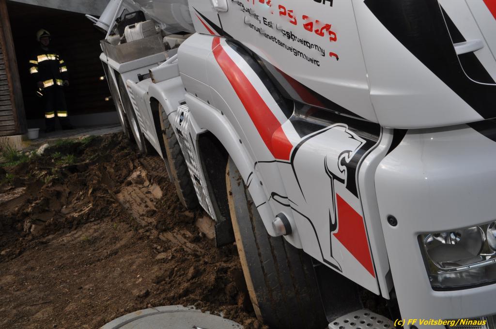 Ein beladener 4-Achs-Betonmischer kam beim Rückwärtsfahren auf einer Privatstrasse von dieser ab und geriet mit der rechten Seite in eine aufgeweichte Wiese und drohte umzustürzen.