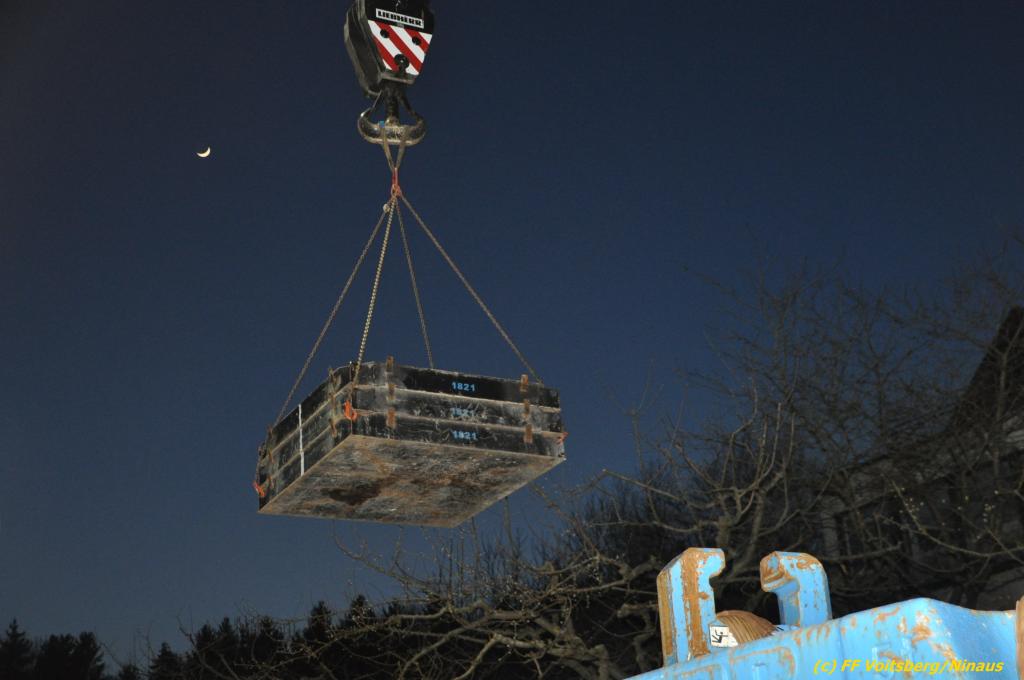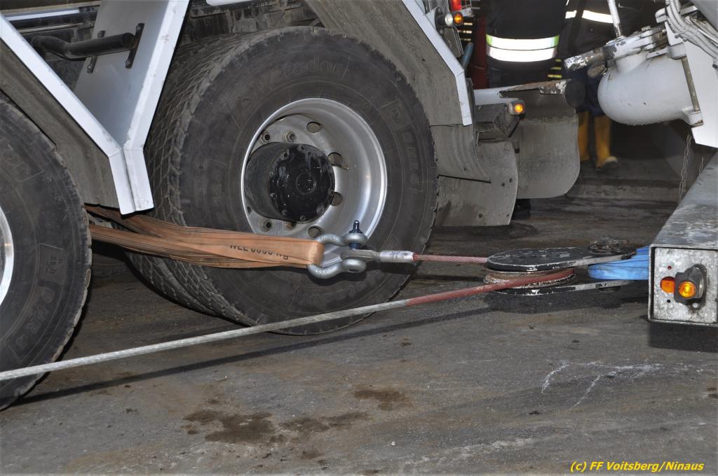 Nach umfangreichen Vorbereitungsarbeiten durch die Fachfirma mit Unterstützung der FF Voitsberg wurde das 35t schwere Fahrzeug unter Mithilfe der Seilwinde des WLF Voitsberg und den Pumpwagen sicher auf die Privatstrasse gehoben und konnte die Fahrt auf eigener Achse fortsetzen.