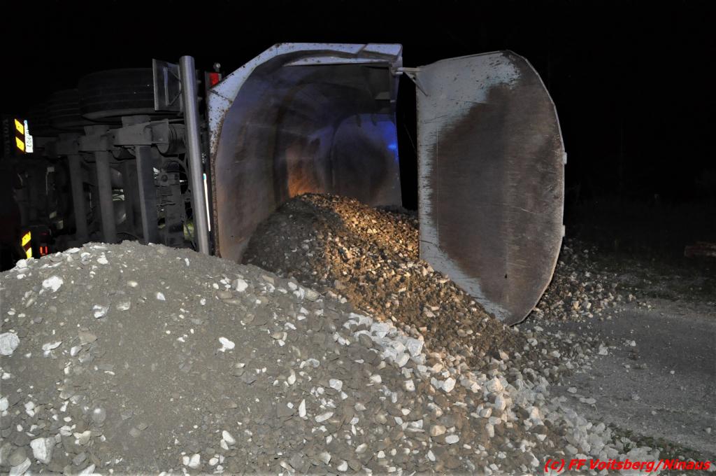 Der Unfall ereignete sich während des Entladens von Schotter, nachdem der aufgekippte Aufleger umstürzte und das Zugfahrzeug mitriss. Zwei anwesende Personen waren unmittelbar zur Stelle und retteten gemeinsam den Lenker durch die Dachluke.