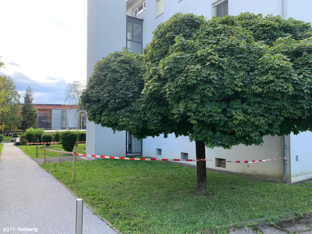 VOITSBERG, am 15.09.2024 Durch den Sturm löste sich ein Teil der Kaminumrandung und fiel zu Boden. Die MRAS-Einheit der FF Voitsberg sicherte den Rest der Umrandung mit Ratschengurten. Der Platz vor dem Mehrfamilienhaus wurde gesichert und gesperrt.