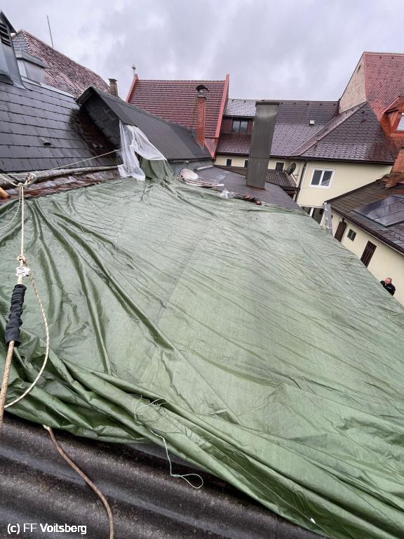 Die FF Voitsberg sicherte in Zusammenarbeit mit privaten Personen die Einsatzstelle am Voitsberger Hauptplatz und machte das Dach provisorisch mit Planen aufgrund starken Regens dicht.