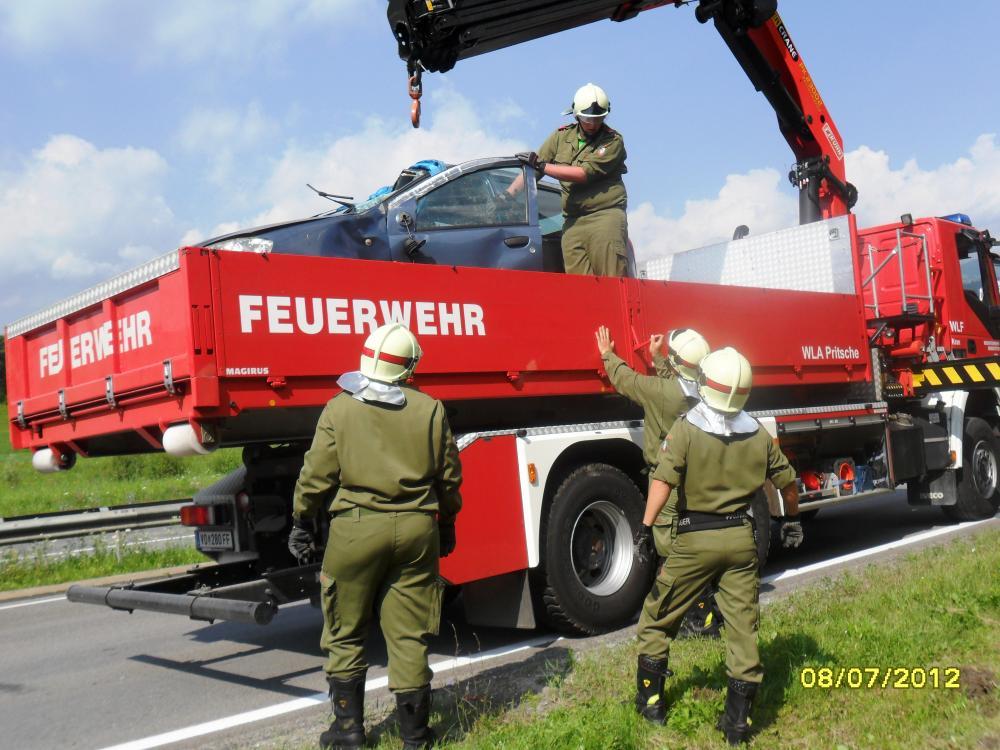 VOITSBERG, am 08.07.2012 Aus ungeklärter Ursache geriet ein PKW auf das Bankett der B 70 und stürzte sich überschlagend Richtung Bahngeleise und kam kurz davor zu stehen. Die Lenkerin konnte sich selbst befreien und wurde mit Verletzungen unbestimmten Grades ins LKH Voitsberg eingeliefert. Die Bergung des verunfallten PKW wurde mit dem WLF-Kran der FF Voitsberg durchgeführt.