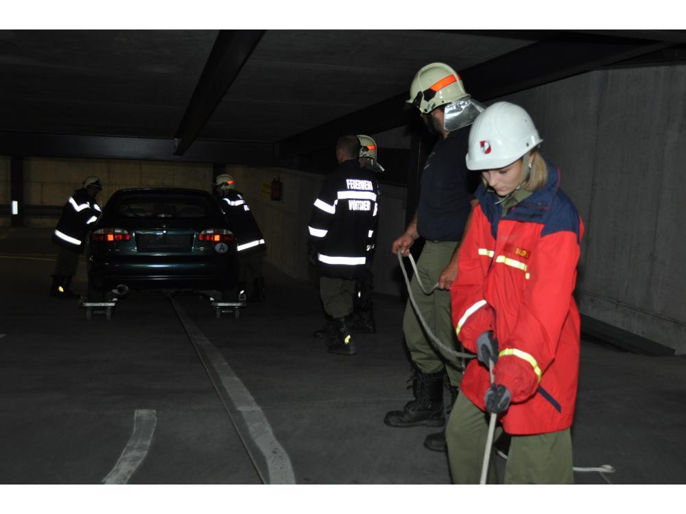 VOITSBERG, am 17.09.2012 Übungsannahme war ein Brand eines PKW mit einer im Fahrzeug befindlichen Person. Bergung und Erstversorgung der Person unter schwerem Atemschutz und Transport ins Freie. Löschen des Fahrzeuges ebenfalls unter Atemschutz und u.a. die Verwendung der Steigleitung im Parkhaus. Bergung des PKW mittels Abschlepproller unter Sicherung mit MRAS. Abtransport des KFZ mittels Abschleppachse.