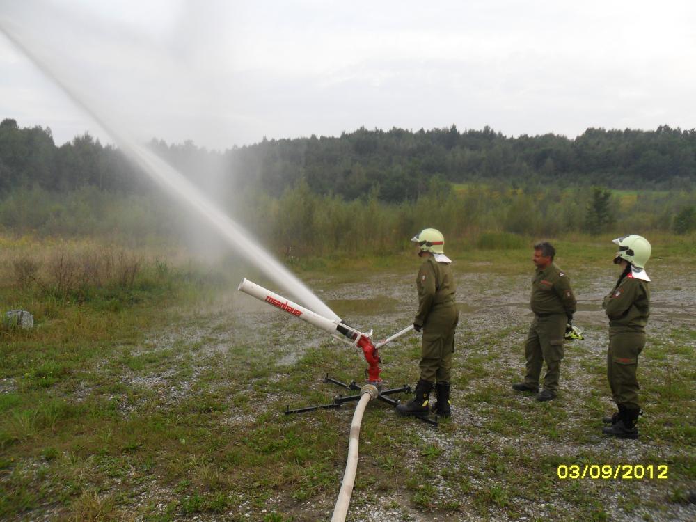 VOITSBERG, am 03.09.2012 Im ehemaligen Bergbaugelände Zangtal wurde eine Ausbildungsübung zum Thema „Waldbrandbekämpfung“ durchgeführt. BM Bernd Unger erklärte den optimalen Einsatz einer Tragkraftspritze. Die taktisch richtige Verwendung von C-Rohr, B-Rohr und Wasserwerfer bei der Waldbrandbekämpfung in Hinblick auf die Aufbringung von Löschwasser und die Deckungsbreite der Strahlrohre wurde ebenfalls erklärt. Im praktischen Teil wurde die Kombination Tragkraftspritze mit Wasserwerfer auf Lafette beübt.