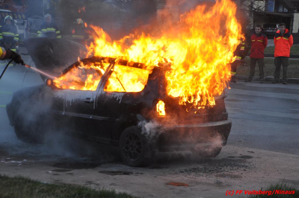 Der zweite Teil umfasste das Thema Autobrand. Bei einem solchen Brand kommt es zur Klassifizierung von vier Brandklassen (A,B,C und D). Speziell krebserregende Kunststoffe bei den Fahrzeugen führen immer mehr zu Problemen bei der Brandbekämpfung. Deswegen ist bei einem in Brand stehenden Fahrzeug ausschließlich der Brandangriff unter schwerem Atemschutz durchzuführen, erklärte Wehrkommandant HBI Ing. Klaus Gehr bei seinem Vortrag. Praktisch wurde mit einem neuen Löschgerät (tragbarer Feuerlöscher "Poly Portex SL 10") dessen effiziente und schnelle Wirkung bei solchen Einsätzen gezeigt. Mit dem HLF 3 Tunnel wurde letztlich ein erfolgreicher Löschangriff mit Schaum beübt.