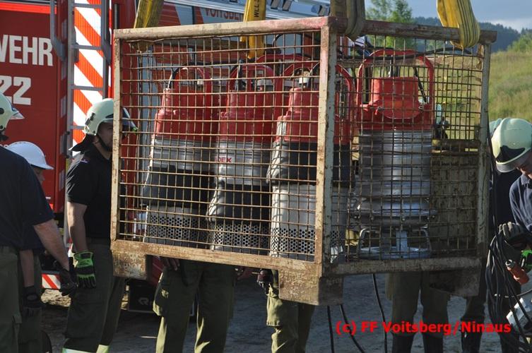 VOITSBERG, am 04.07.2016 Im ehemaligen Tagbaugelände Zangtal fand eine Übung mit dem Stromgenerator und Hochleistungs-Tauchpumpen statt. Als Auffrischung bereiteten HBI Ing. Klaus Gehr und LM d. F. Harald Kremaucz diese Übung vor, um in der bevorstehenden Gewitterzeit gerüstet zu sein. Mit den 5 Hochleistungspumpen wurden in 10 min ca. 100.000 Liter Wasser mit einer Energieleistung von 43 KV umgepumpt. Diese Pumpen haben bereits u.a. bei größeren Einsätzen (Oberndorf/Salzburg, Bahnhof Voitsberg) ihre Leistung bewiesen.