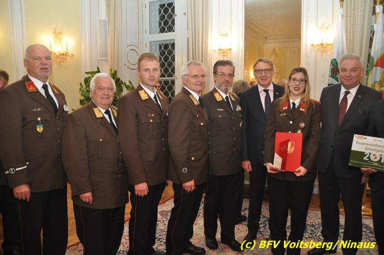 Der netten Feierstunde in der altehrwürdigen Grazer Burg wohnten HBI Ing. Klaus Gehr und HBM dV Walter Ninaus (für die FF Voitsberg), sowie BerFwKdt LFR Engelbert Huber, BR Christian Leitgeb und ABI Alfred Jauk bei.
