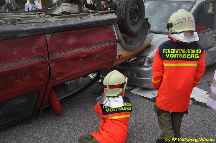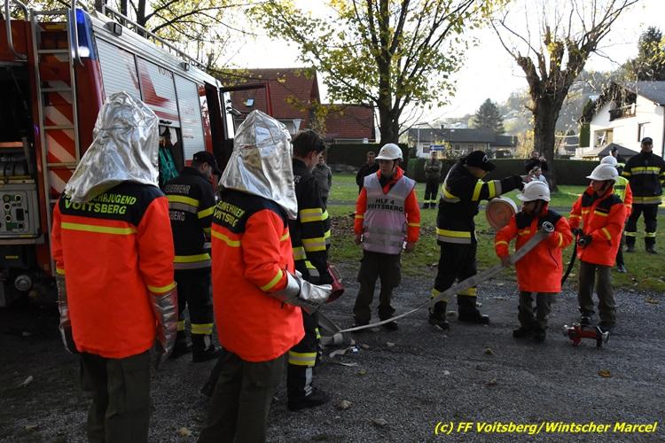 VOITSBERG, am 27.10.2017 Im Rahmen einer 24-Stunden-Übung der Feuerwehrjugend der Feuerwehren Afling, Bärnbach, Maria Lankowitz, Rosental und Voitsberg fand am 28. Oktober um 15 Uhr am Vorplatz des Rüsthauses Voitsberg eine technische Einsatzübung statt. Übungsannahme war nach einem Zusammenstoß zweier PKW die Rettung von zwei eingeklemmten Personen mit hydraulischer Schere und Spreizer, sowie die Absicherung der Unfallstelle und dem Herstellen eines Brandschutzes. Die 30 beteiligten Jugendlichen konnten die gestellten Aufgaben vor vielen anwesenden Verwandten und Feuerwehrfunktionären mit vollster Zufriedenheit der Ausbilder lösen. Weitere Übungsorte dieser 24-Stunden-Übung waren in Bärnbach, Afling und Rosental.