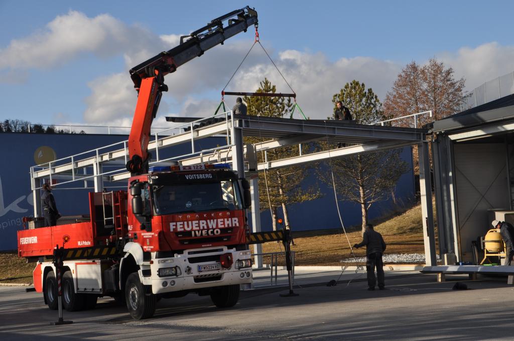 Nachdem der FF Voitsberg Anfang 2021 eine Mulde für den Wechsellader durch den Bereichsfeuerwehrverband Voitsberg zur Verfügung gestellt wurde, galt es diese nun auch geschützt zu lagern. Hierfür wurde gemeinsam mit der Stadtgemeinde ein Zubau in Form eines Flugdaches geplant und nun umgesetzt.