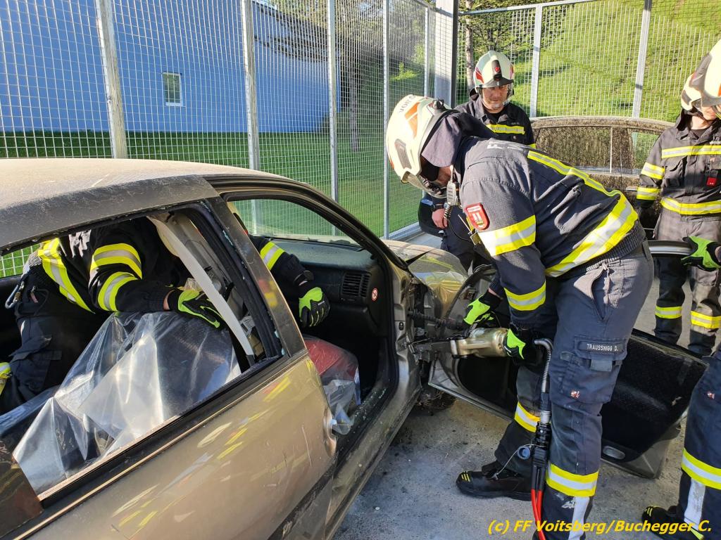 Anschließend ordnete der Übungseinsatzleiter LM d.F. Christian Rozic eine schonende Rettung der verunfallten Personen an. Der Lenker wurde mit Hilfe des Spineboards über den Kofferraum gerettet. Zur Befreiung des Beifahrers mussten beide Fahrzeugtüren und die B-Säule mittels hydraulischem Rettungsgerät entfernt werden. Die Verletzten wurden anschließend von Feuerwehrsanitätern versorgt.