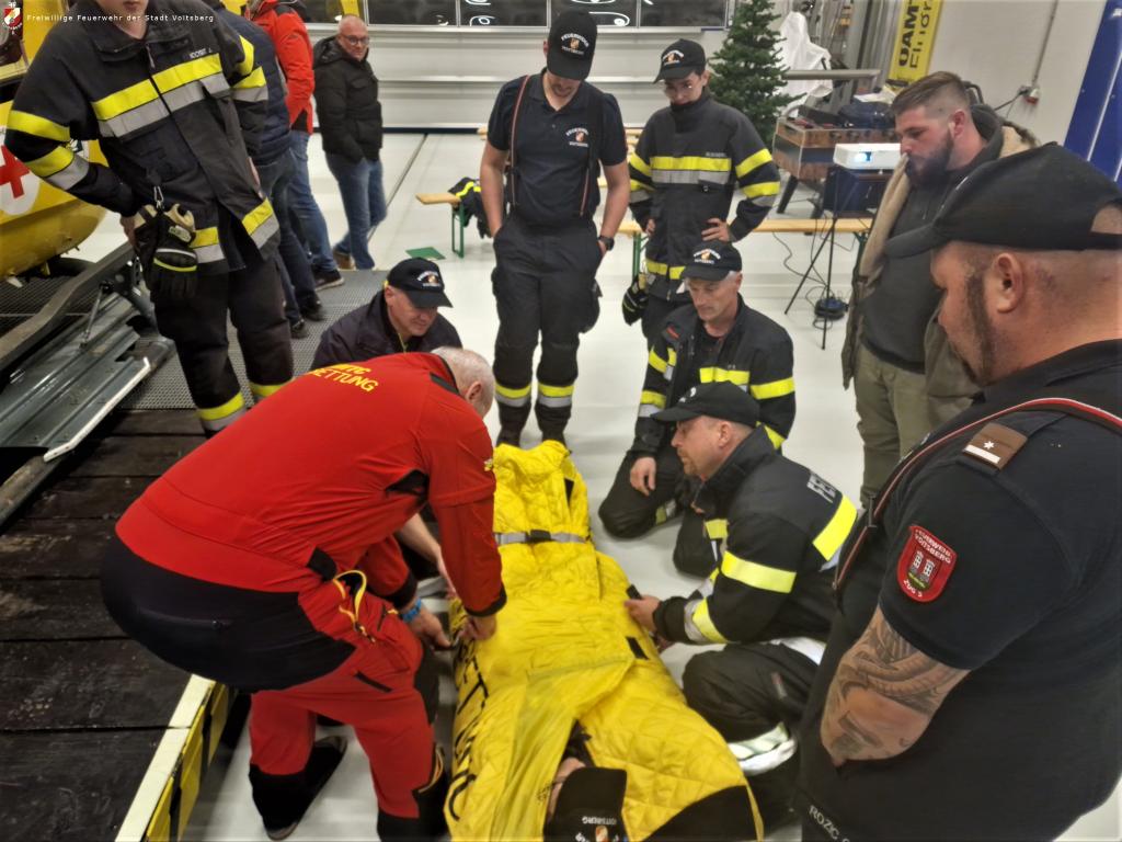 Da die FF Voitsberg bei möglichen Unglücksfällen bei den häufigen Flugbewegungen am LKH Voitsberg zuständig ist, wurde mit der Flugeinsatzstelle Graz-Thalerhof diese Schulung angeregt.