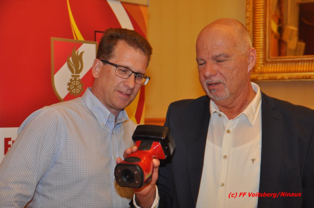 Die FF Voitsberg mit OBI Michael Münzer und FM Victoria Fink führte in einer kleinen Ausstellung die Schutzkleidung vor, erklärte den Interessierten die Wärmebildkamera und beantwortete die vielen Fragen.