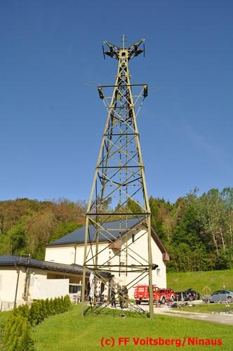 Erste Übungsannahme war die Rettung einer verletzten Person aus misslicher Lage vom einem 17m hohen Gittermasten, wobei der Retter mit Selbstsicherung sich zum Verletzten hocharbeitete. Um die Person retten zu können, mussten zwei Seile ca. 2 m über den Verunfallten angebracht werden, damit eine rasche und vor allem sichere Rettung gewährleistet war.