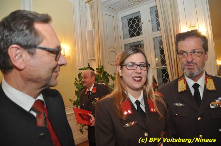 Der netten Feierstunde in der altehrwürdigen Grazer Burg wohnten HBI Ing. Klaus Gehr und HBM dV Walter Ninaus (für die FF Voitsberg), sowie BerFwKdt LFR Engelbert Huber, BR Christian Leitgeb und ABI Alfred Jauk bei.
