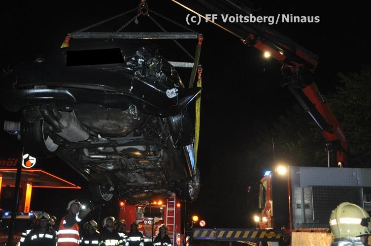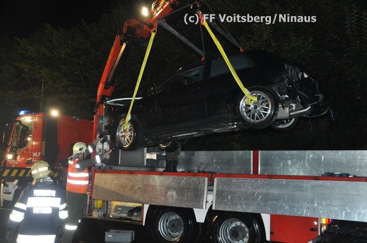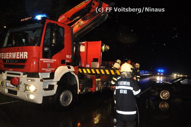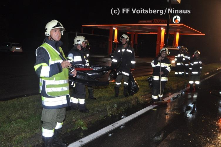 VOITSBERG, am 02.09.2015 Ein PKW kam auf der Umfahrungsstraße Voitsberg der B 70 auf Höhe Tankstelle in Krems ins Schleudern, stieß gegen eine Leitschiene und eine Bordsteinkante und kam mitten der Fahrbahn auf den Rädern zu stehen. Glücklicherweise kam kein Fahrzeug entgegen. ansonsten wäre ein Frontalzusammenstoß wohl unvermeidlich gewesen. Die alarmierte FF Krems sicherte die Unfallstelle ab, entfernte herumliegende Wrackteile und regelte den Verkehr. Das WLF-Kran der Stadtfeuerwehr Voitsberg barg das schwer beschädigte Fahrzeug und brachte es von der Unfallstelle. Die polizeilichen Erhebungen führte die Polizei Voitsberg durch. Nach ersten Angaben wurde niemand verletzt. Eingesetzt waren die FF Krems mit TLFA und KLF und 15 Mann und die FF Voitsberg mit WLF-Kran und KRFB mit 6 Mann sowie eine Polizeistreife mit 2 Beamten. Einsatzleiter: HBI Günter Poschner, FF Krems