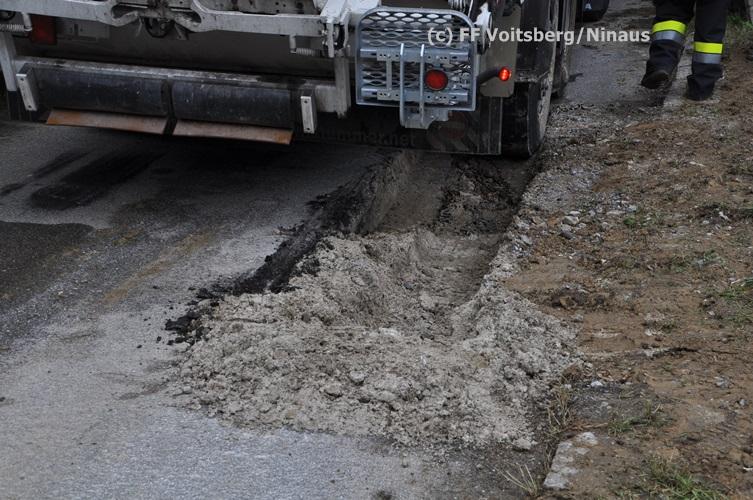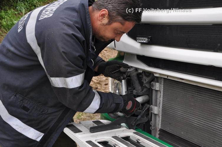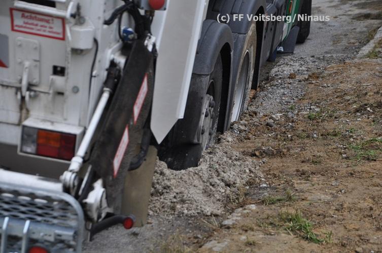 VOITSBERG, am 03.09.2015 Ein LKW geriet mit den zwei rechten hinteren Rädern in eine Künette und konnte blieb im Erdreich stecken. Die Bergung erfolgte mit der Seilwinde des WLF-Kran. Der LKW konnte die Fahrt auf eigener Achse wieder fortsetzen. Im Einsatz standen das WLF-Kran und das KRFB mit 6 Mann.