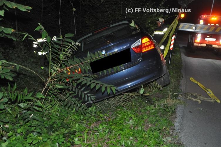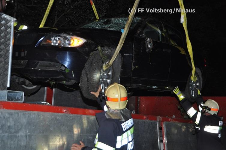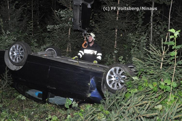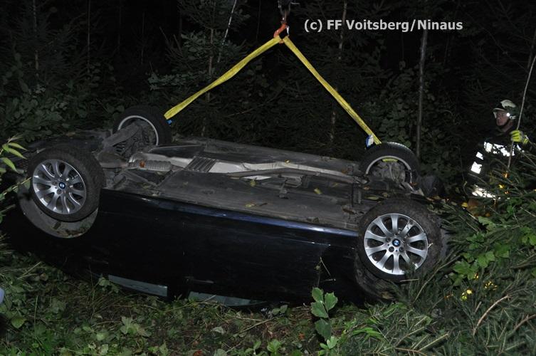 VOITSBERG, am 09.09.2015 Ein PKW kam aus unbekannter Ursache auf einer Gemeindestrasse bergwärts fahrend von der Straße ab, überschlug sich und kam mit den Rädern nach oben zu liegen. Der Fahrzeuglenker konnte sich aus dem beschädigten Fahrzeug unverletzt befreien. Die Bergung erfolgte mit dem WLF-Kran.