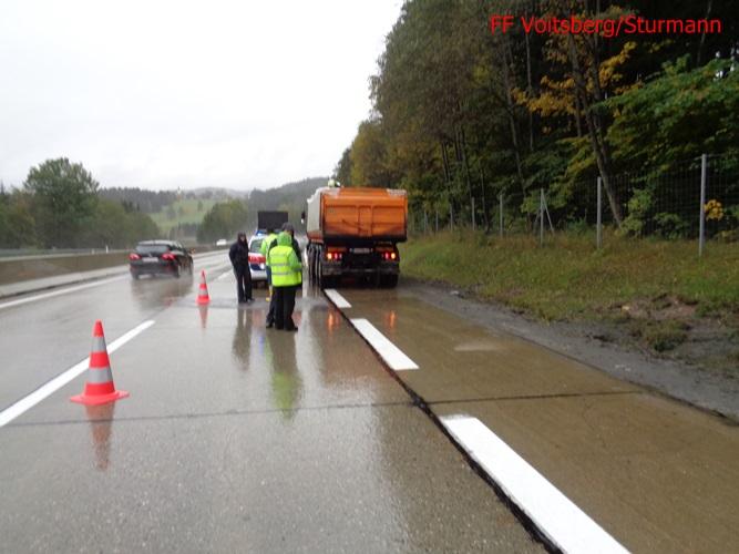 VOITSBERG, am 11.10.2015 Am Vortag ereignete sich auf der A 2 zwischen Mitterbergtunnel und Abfahrt Modriach ein Verkehrsunfall mit einem LKW, welcher umstürzte. Einsatz von ÖF Voitsberg wurde am 11.10. angeordnet. Errichten einer Ölsperre und Anbringen von Bindemittel auf dem Pannenstreifen mit anschließender Entsorgung.