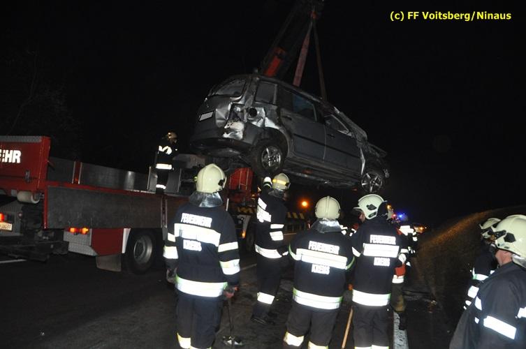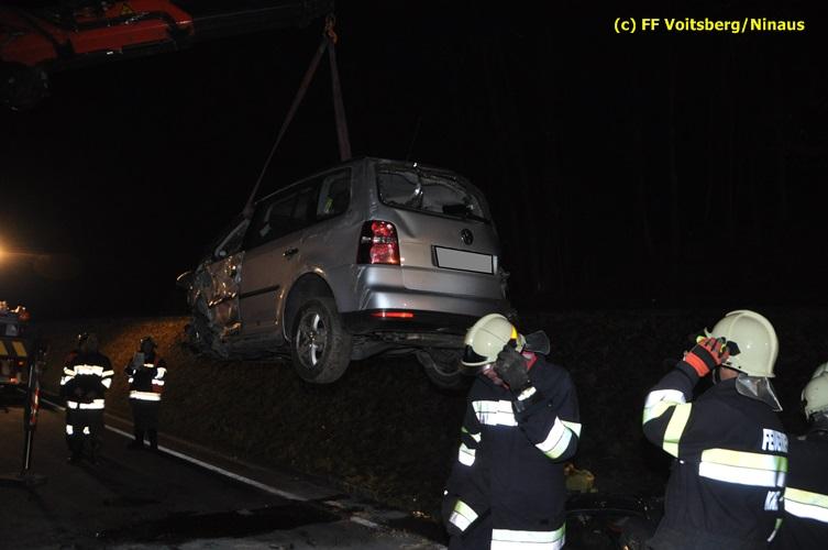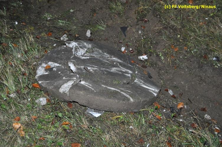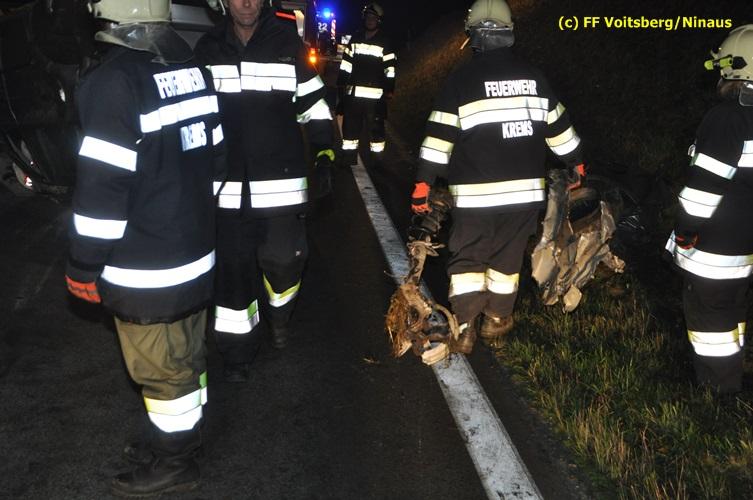 VOITSBERG, am 04.11.2015 Aus ungeklärter Ursache geriet in den Kremser Reihen ein in Richtung Graz fahrender PKW ins Schleudern, geriet auf das Bankett, überschlug sich mehrmals und kam am Dach liegend auf der Fahrbahn zu stehen. Darauffolgende Fahrzeuglenker konnten ihre Fahrzeuge gerade noch ohne eine Kollision am total beschädigten PKW vorbeimanövrieren. Beim Abkommen von der Straße wurde eine Betonplatte, welche als Kanalabdeckung diente, 15 m durch die Luft geschleudert. Weitere Wrackteile flogen Richtung Bahndamm, ohne jedoch den Zugverkehr zu behindern. Die alarmierte FF Krems sicherte die Unfallstelle ab, baute einen Brandschutz auf und band ausgeflossene Betriebsmittel mittels Bindemittel und entsorgte dieses fachgerecht. Das WLF Voitsberg barg das Autowrack und entfernte es von der Unfallstelle. Die Polizei sperrte während der Bergungs- und Aufräumarbeiten die B 70 für ca. 20 Minuten zur Gänze. Das Rote Kreuz versorgte den leicht verletzten Lenker und brachte ihn ins LKH Voitsberg.