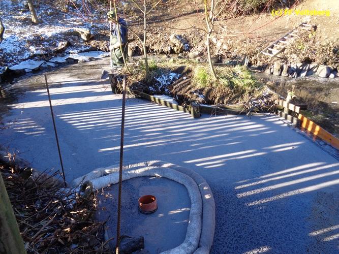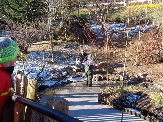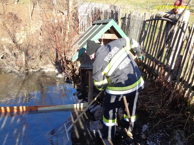 VOITSBERG, am 28.11.2015 Heizöl geriet in einen Fischteich - Errichten einer Ölsperre - Ölbindemittel wurde aufgestreut - Entsorgung des getränkten Bindemittels - Auslegen eines Flies