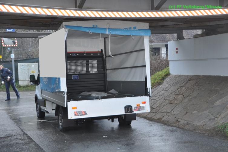 VOITSBERG, am 17.12.2015 Nachdem ein Lenker mit einem Leih-Kleintransporter die Bahnunterführung mit einer Maximalhöhe von 2,60 Meter unterschätzte, blieb er mit dem Aufbau unter der Brücke stecken und konnte weder vor noch zurück. Es wurde versucht, mittels Luftablassen das Fahrzeug zu bergen, was aber misslang. Die alarmierte FF Voitsberg lockerte den Aufbau, beschwerte die Ladefläche mit Mannes(Frauen)kraft und fuhr den Wagen unter der Brücke heraus. Nachdem mittels Kompressor des HLF 3 Tunnel der Reifendruck wieder hergestellt wurde, konnte der Lenker die Fahrt wieder fortsetzen. Am Fahrzeug und an der Brücke entstand leichter Sachschaden. Die GKB wurde seitens der Polizei verständigt.