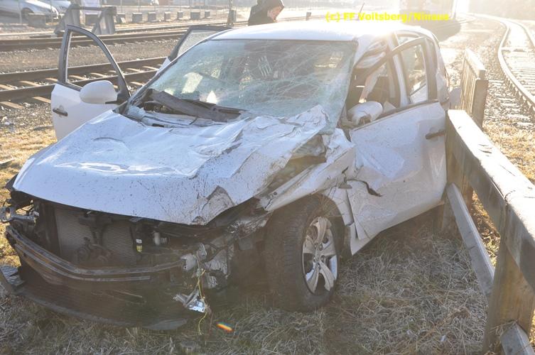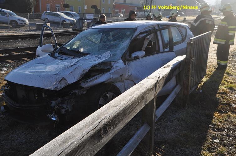 VOITSBERG, am 23.12.2015 Großes Glück hatte ein PKW-Lenker mit seinem Fahrzeug, als er in der Kowaldstrasse in Voitsberg die auf rot stehende Ampel bei der Eisenbahnübersetzung vermutlich übersah. Er wurde von dem in Richtung Graz fahrenden Personenzug im linken vorderen Bereich erfasst und zur Seite geschleudert. Wie durch ein Wunder konnte der Lenker das Fahrzeug selbständig verlassen und wurde zum Glück nur leicht verletzt und vom Roten Kreuz ins LKH Voitsberg eingeliefert. Die Aufräumungs- und Bergungsarbeiten wurden von der Stadtfeuerwehr Voitsberg durchgeführt. Die Polizei Voitsberg führte die Erhebungen durch. Die ebenfalls alarmierte FF Krems war als Reserve am Einsatzort. Am Triebwagen der GKB entstand leichter Sachschaden. Fahrgäste wurden nicht verletzt.