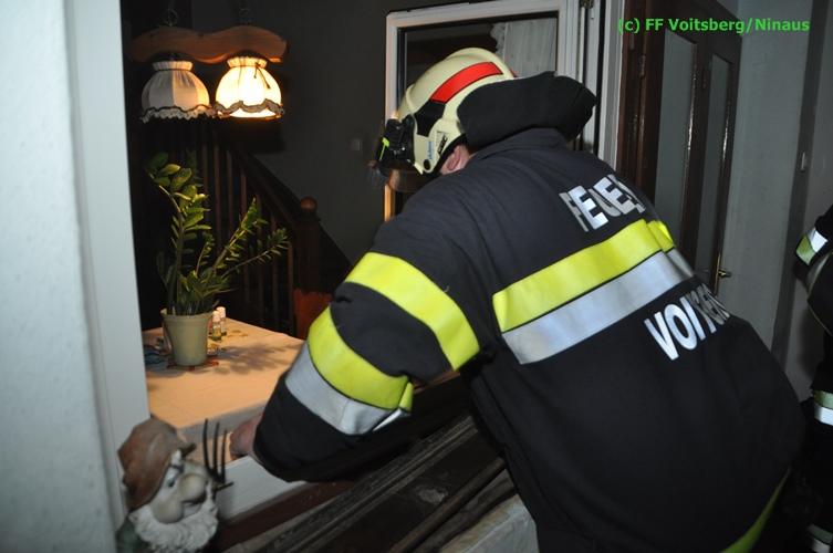 VOITSBERG, am 26.12.2015 Nachdem eine ältere Frau in ihrer Wohnung stürzte und sich dabei leicht verletzte, konnte sie nicht zum Telefon gelangen, um Hilfe zu holen. Nachbarn hielten Nachschau und hörten die Hilferufe aus der versperrten Wohnung und alarmierten Rettung, Feuerwehr und Polizei. Die FF Voitsberg öffnete die Eingangstüre und stieg gleichzeitig nach Öffnen eines Fensters in die Wohnung ein. Das Rote Kreuz versorgte die Frau und brachte sie ins LKH Voitsberg.