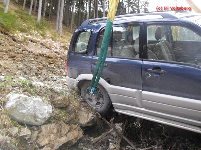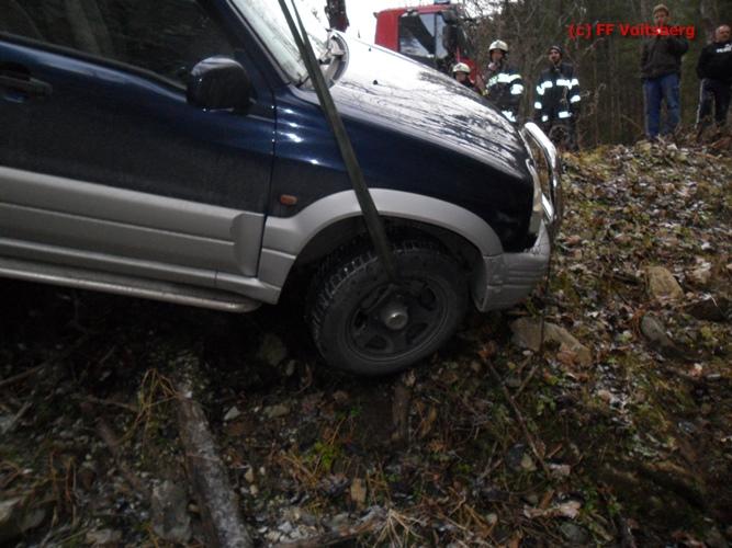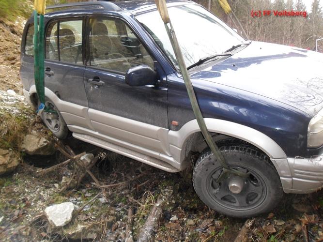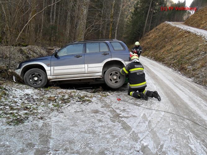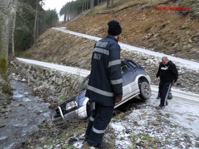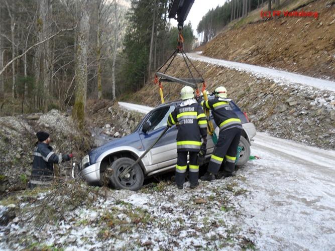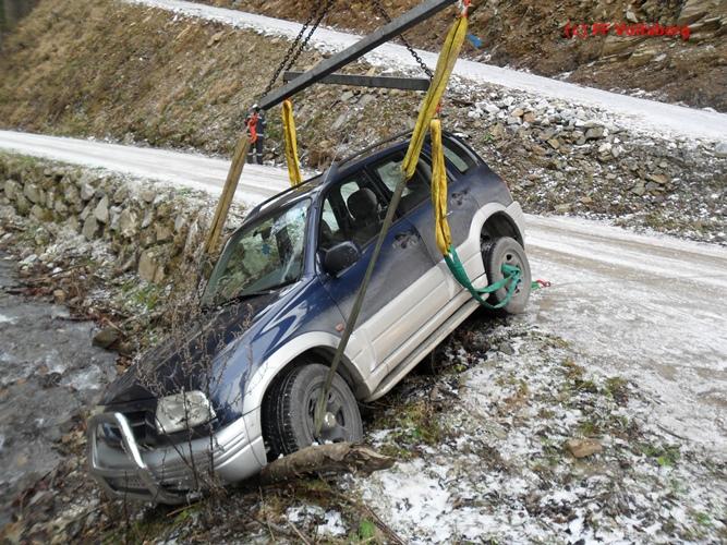 VOITSBERG, am 13.01.2016 Bergung eines auf schneeglatter Fahrbahn über eine Böschung gestürzten PKW über Anforderung der FF Kainach mittels WLF-Kran Voitsberg.