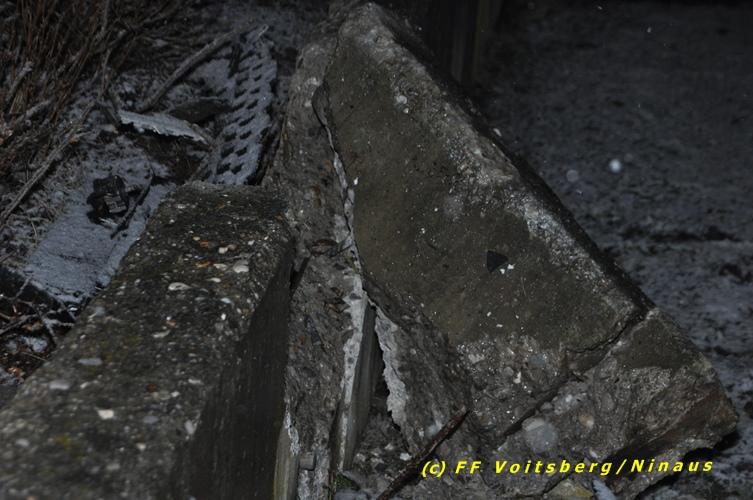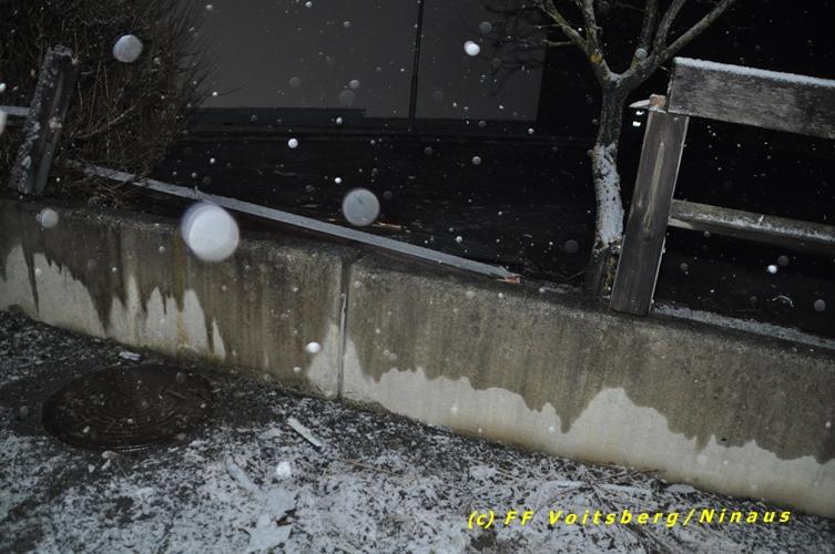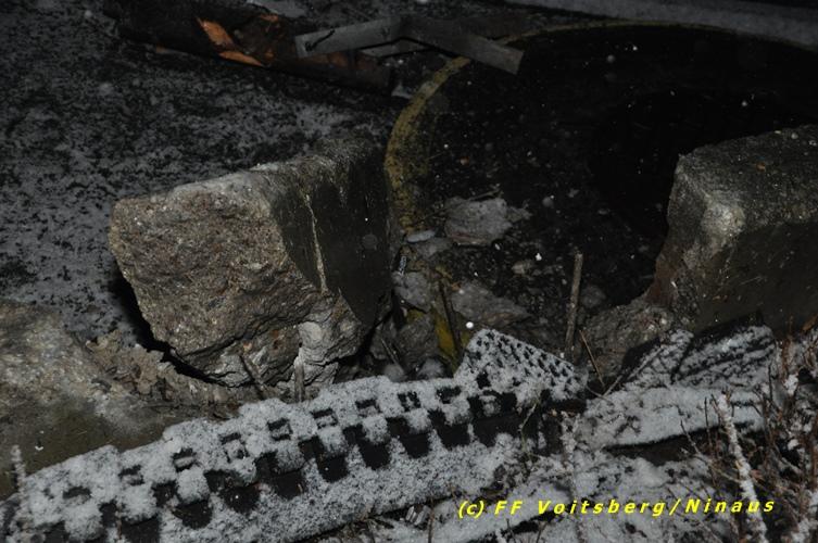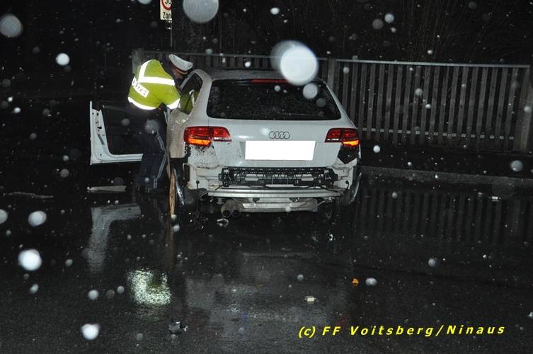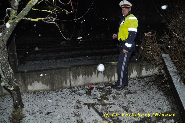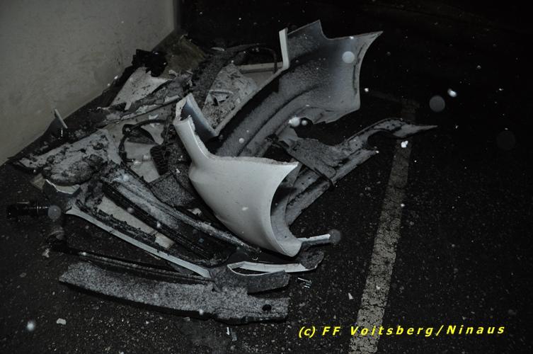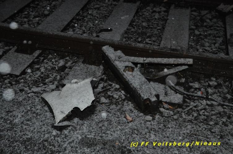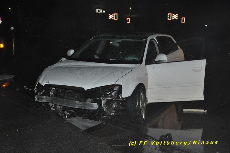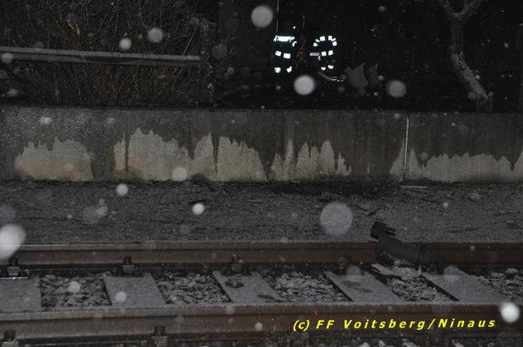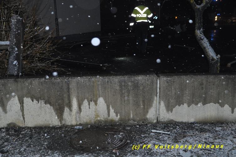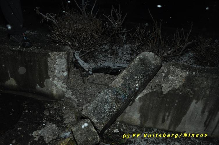 VOITSBERG, am 17.02.2016 Ein PKW durchstieß ein Holzgeländer, stürzte über eine 30 cm hohe Betonmauer auf den Gleiskörper der GKB, schlitterte über diesen, beschädigte dabei wahrscheinlich die Elektrik, flog nochmals über eine 40 cm hohe Betonmauer, riss einen Strom-Verteilerkasten um und kam schlussendlich nach ca. 100 Meter in der Bahnhofstrasse in Voitsberg mit Totalschaden zu stehen. Der vermeintliche Lenker blieb unverletzt.