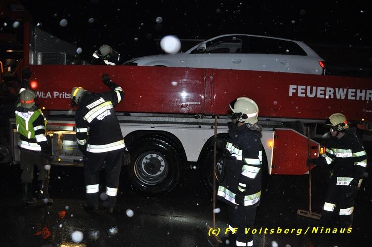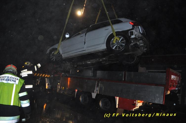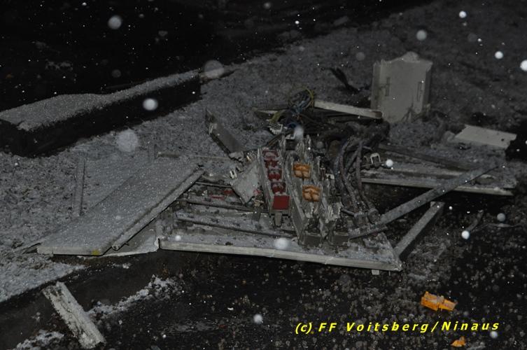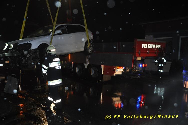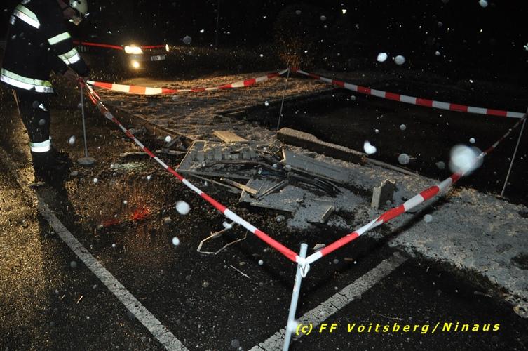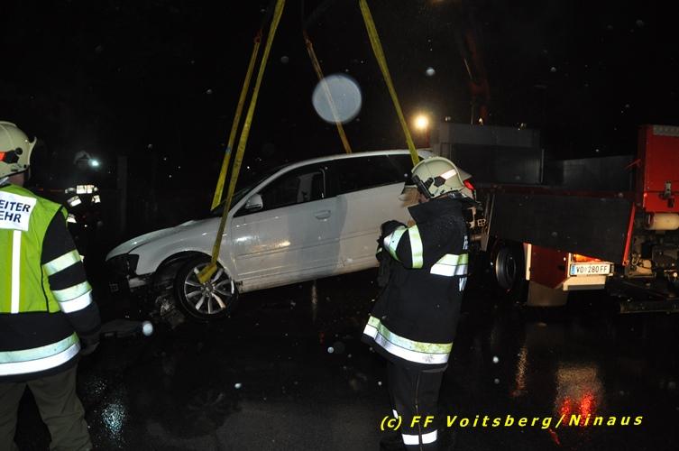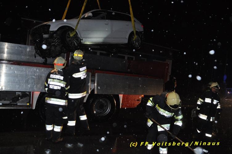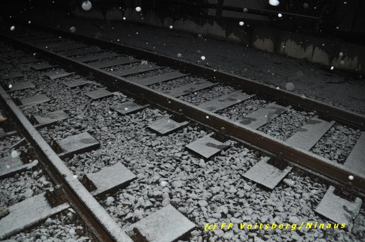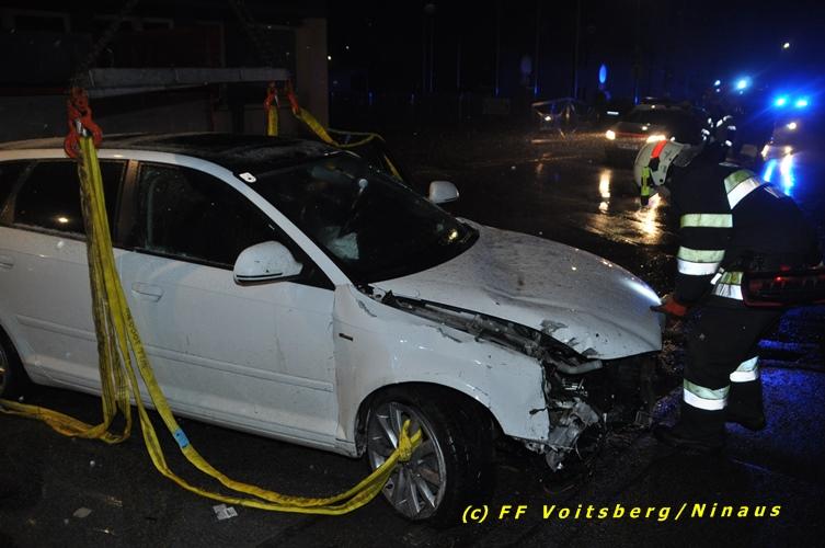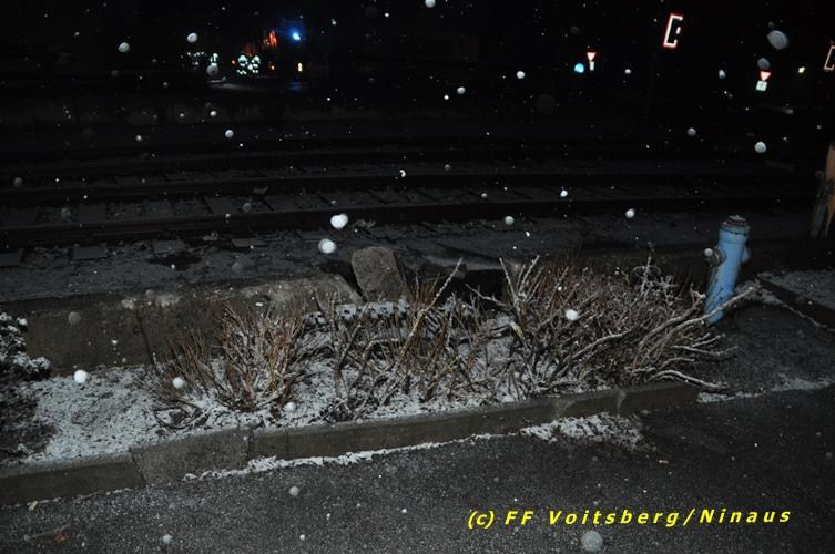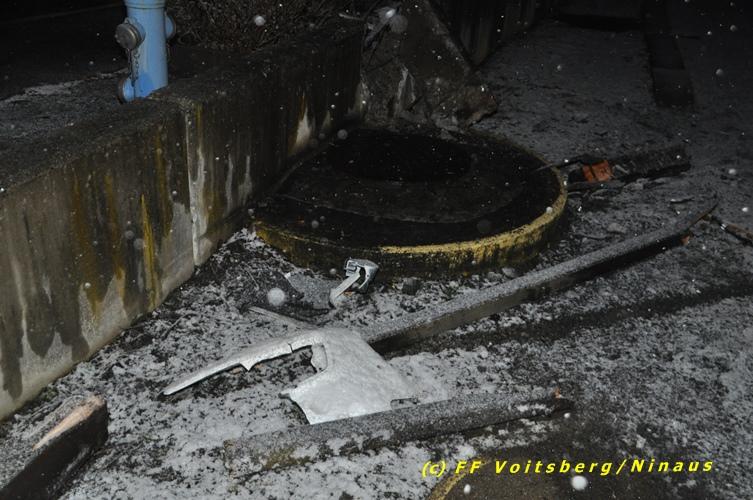 VOITSBERG, am 17.02.2016 Ein PKW durchstieß ein Holzgeländer, stürzte über eine 30 cm hohe Betonmauer auf den Gleiskörper der GKB, schlitterte über diesen, beschädigte dabei wahrscheinlich die Elektrik, flog nochmals über eine 40 cm hohe Betonmauer, riss einen Strom-Verteilerkasten um und kam schlussendlich nach ca. 100 Meter in der Bahnhofstrasse in Voitsberg mit Totalschaden zu stehen. Der vermeintliche Lenker blieb unverletzt.