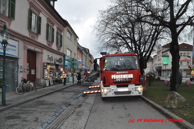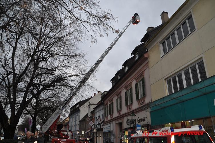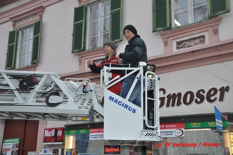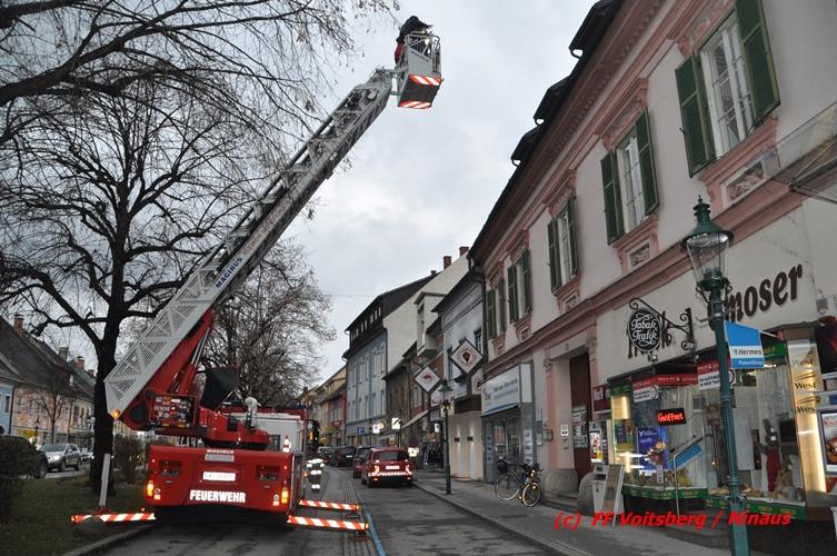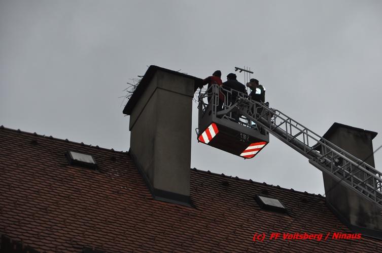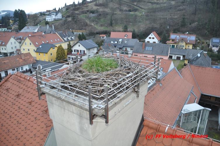 Über den Behördenweg wurden die FF Voitsberg und die FF Köflach eingeladen, sich an dieser Aktion zu beteiligen. Die Aufgabe der FF Voitsberg bestand in der Absicherung der Einsatzstelle von Passanten. Die FF Köflach rückte mit der Drehleiter aus, um die handelnden Kameraden der Berg- und Naturwacht in die Höhe zu hieven, um das neue Nest anbringen zu können. Die Stadtwerke Voitsberg brachte einen Blitzschutz an.