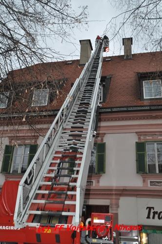 VOITSBERG, am 08.03.2016 Die Kameraden um Toni Plaschzug von der Berg- und Naturwacht rückten aus, um für ein Storchenpaar am Voitsberger Hauptplatz 29 ein renoviertes Zuhause vor dem Eintreffen aus dem Winterquartier in Afrika (10000 km) zu schaffen.
