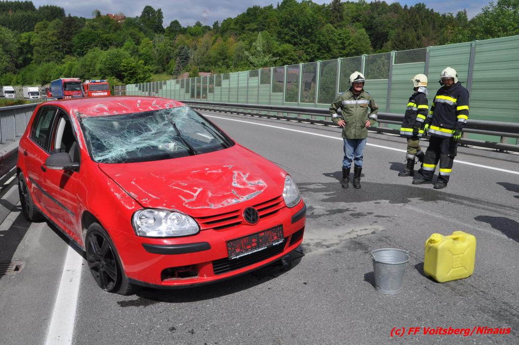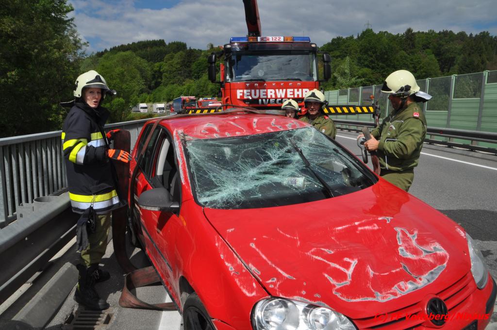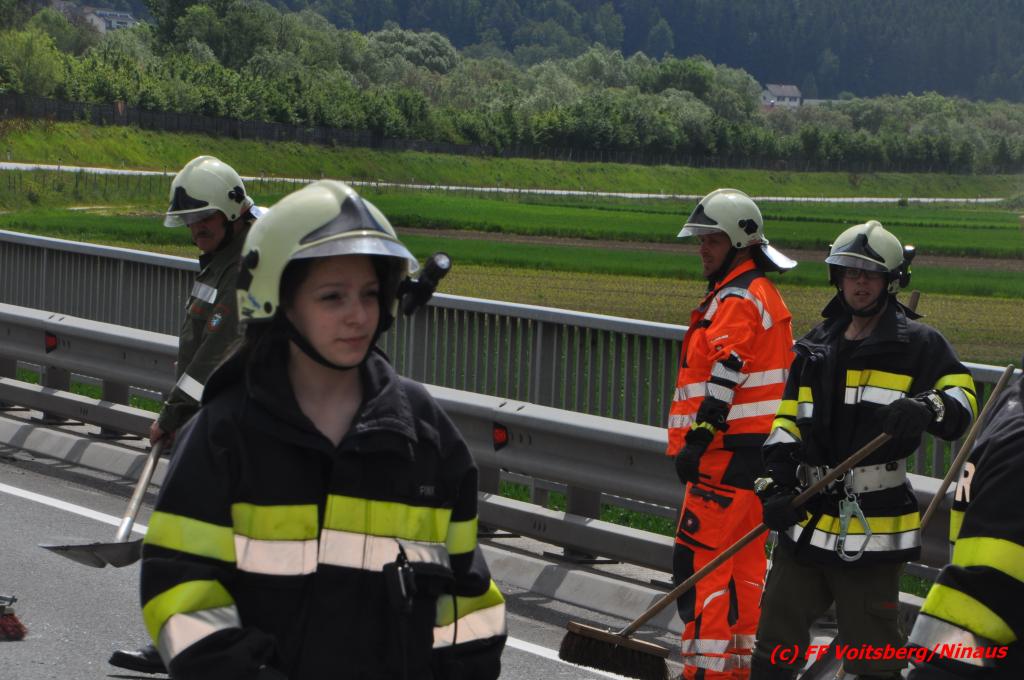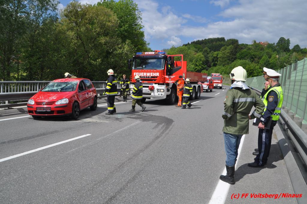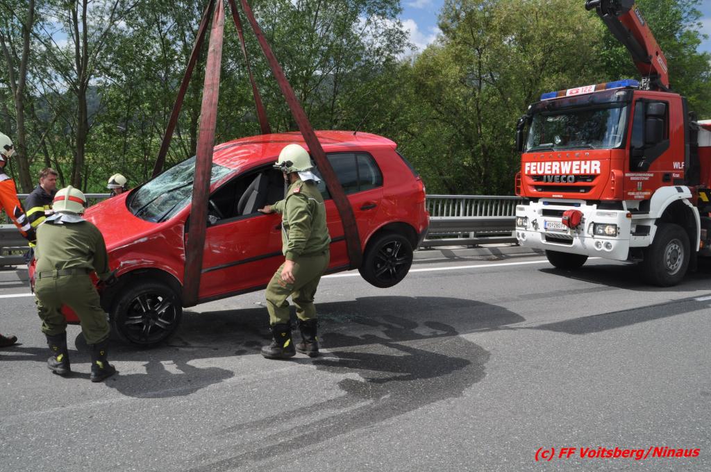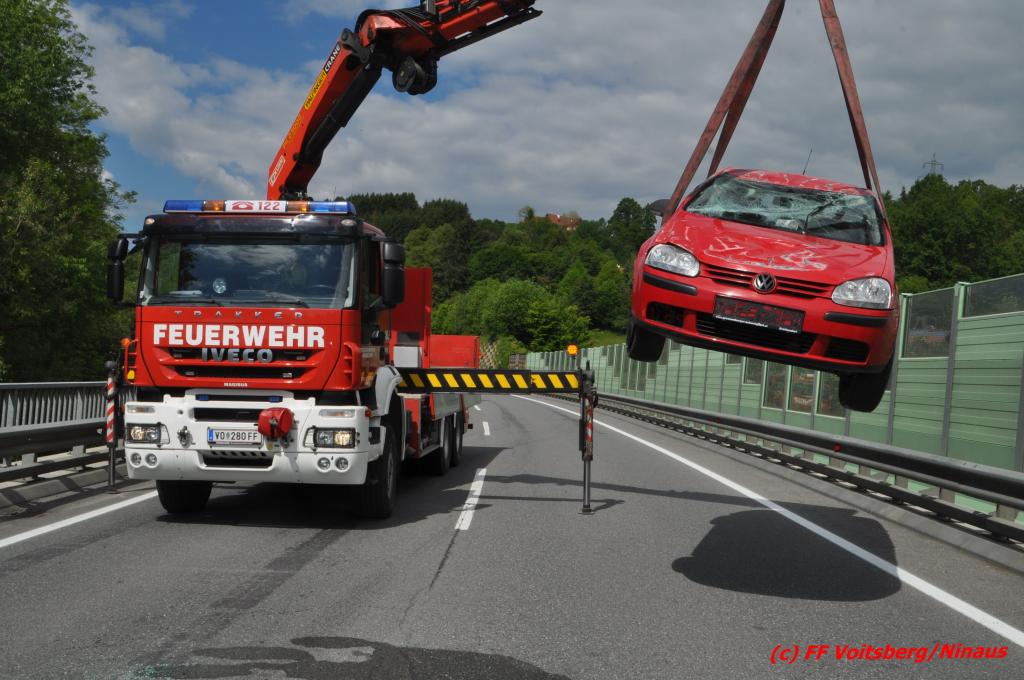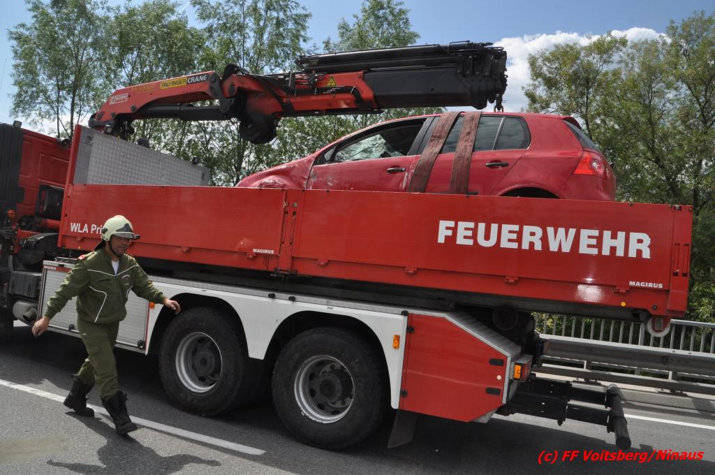 VOITSBERG, am 18.05.2016 Aus ungeklärter Ursache geriet eine Lenkerin mit ihrem PKW am Mittwochvormittag auf der Umfahrungsstraße Krottendorf der B 70 auf eine Leitschiene, schlitterte einige Meter mit den rechten Rädern darauf, kippte um und kam mit den Rädern nach oben in Mitte der viel befahreren B 70 zu liegen. Glücklicherweise herrschte zu diesem Zeitpunkt kein Gegenverkehr, sodass Schlimmeres ausblieb. Die Lenkerin wurde mit leichten Verletzungen am Unfallort vom Notarzt erstversorgt und ins LKH Voitsberg eingeliefert. Das beschädigte Fahrzeug wurde mit dem WLF-Kran der FF Voitsberg geborgen und von der Unfallstelle entfernt. Die Feuerwehren Gaisfeld und Krottendorf sicherten die Unfallstelle ab und reinigten die Fahrbahn von ausgeflossenen Betriebsmitteln mit Bindemittel und entsorgten dieses fachgerecht. Die Polizei sperrte während der Bergungsarbeiten die Umfahrung und richtete eine Umleitung über die alte Bundesstraße ein.