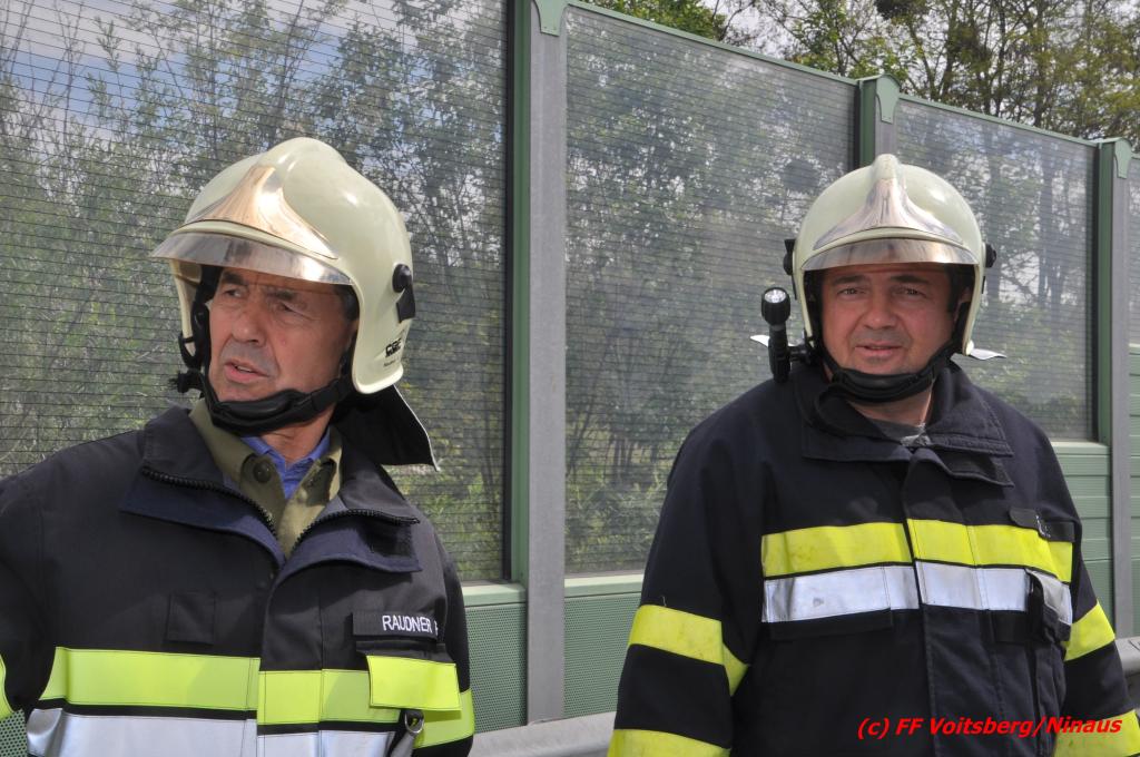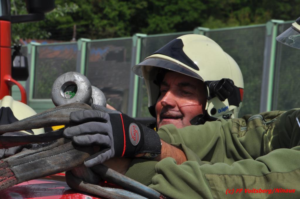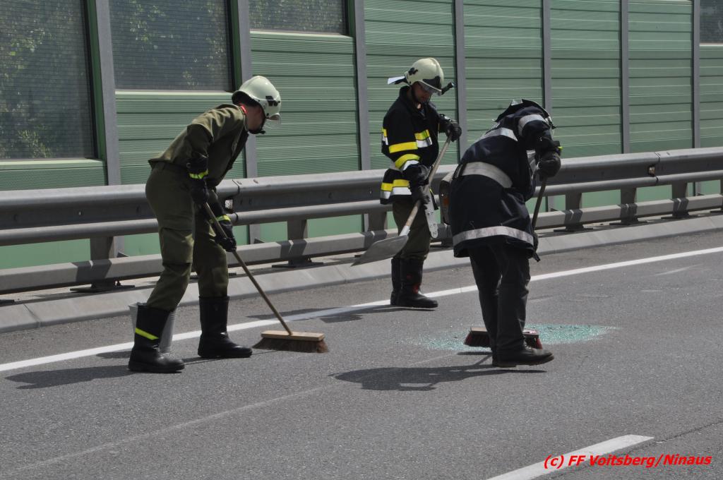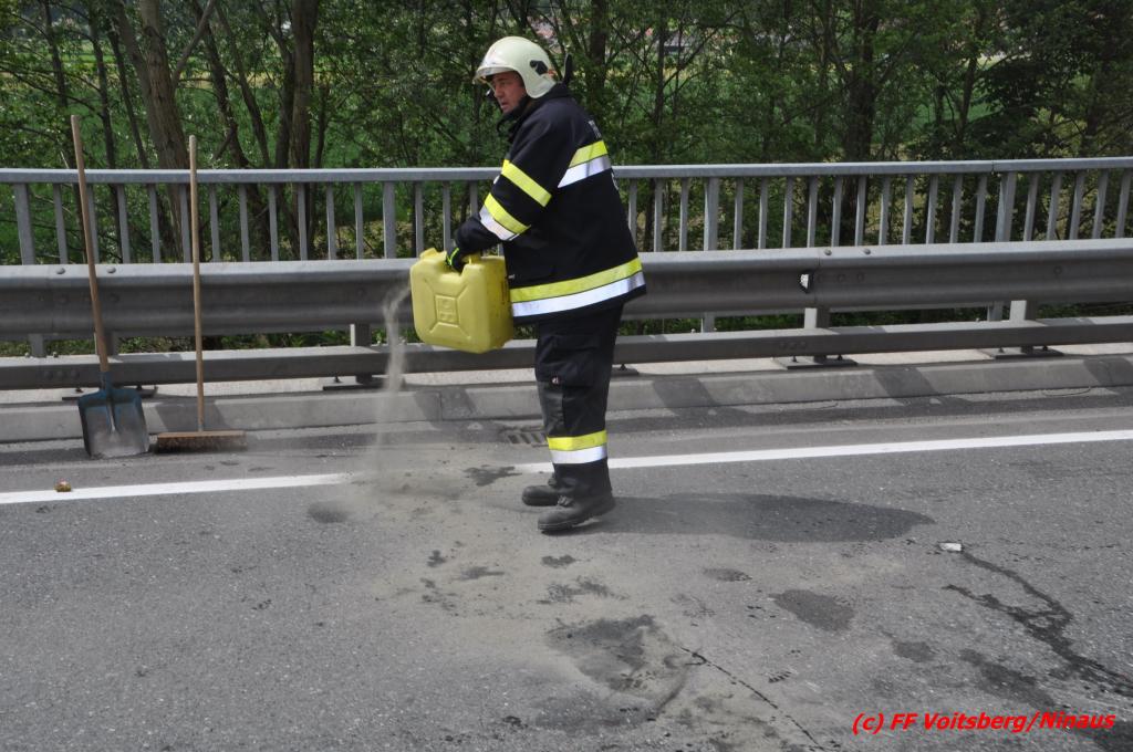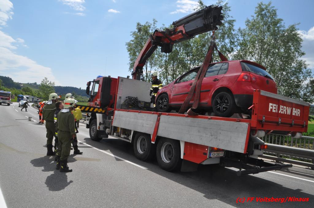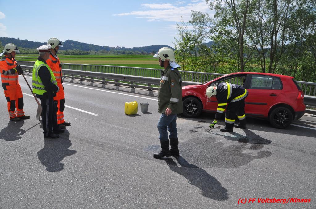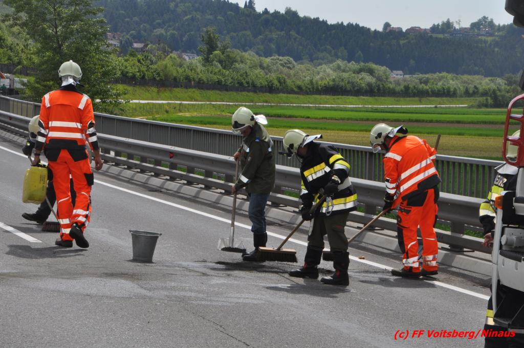 VOITSBERG, am 18.05.2016 Aus ungeklärter Ursache geriet eine Lenkerin mit ihrem PKW am Mittwochvormittag auf der Umfahrungsstraße Krottendorf der B 70 auf eine Leitschiene, schlitterte einige Meter mit den rechten Rädern darauf, kippte um und kam mit den Rädern nach oben in Mitte der viel befahreren B 70 zu liegen. Glücklicherweise herrschte zu diesem Zeitpunkt kein Gegenverkehr, sodass Schlimmeres ausblieb. Die Lenkerin wurde mit leichten Verletzungen am Unfallort vom Notarzt erstversorgt und ins LKH Voitsberg eingeliefert. Das beschädigte Fahrzeug wurde mit dem WLF-Kran der FF Voitsberg geborgen und von der Unfallstelle entfernt. Die Feuerwehren Gaisfeld und Krottendorf sicherten die Unfallstelle ab und reinigten die Fahrbahn von ausgeflossenen Betriebsmitteln mit Bindemittel und entsorgten dieses fachgerecht. Die Polizei sperrte während der Bergungsarbeiten die Umfahrung und richtete eine Umleitung über die alte Bundesstraße ein.