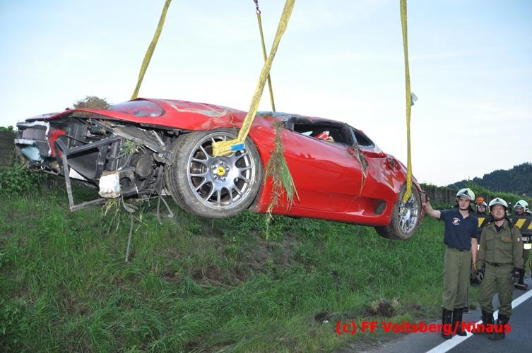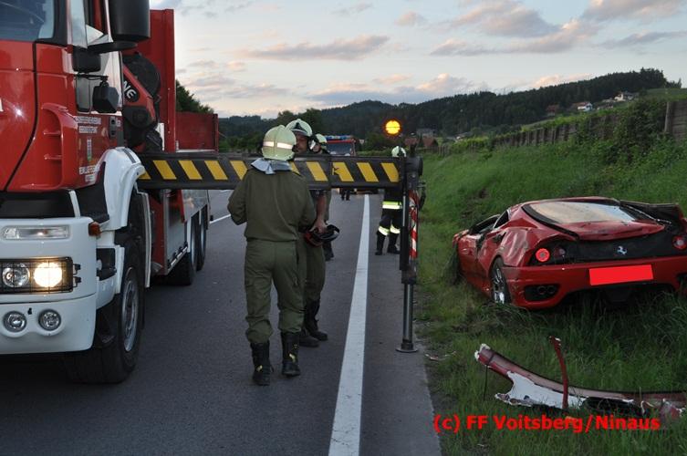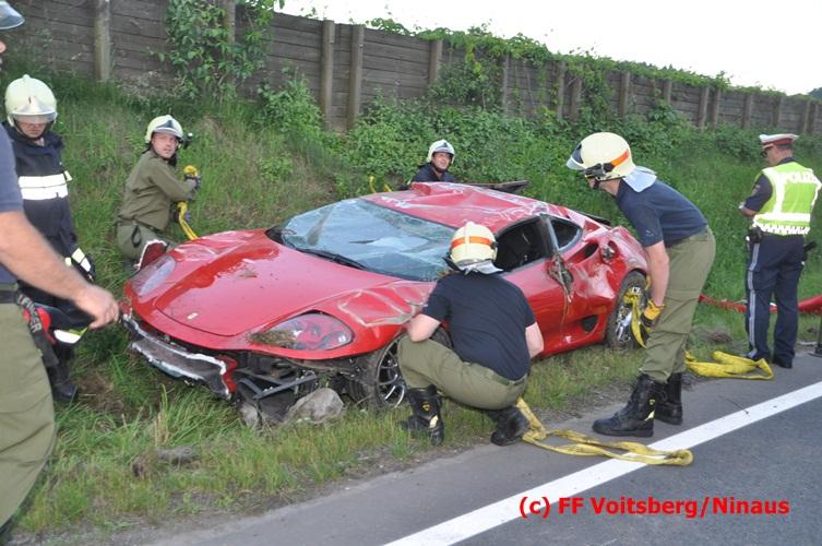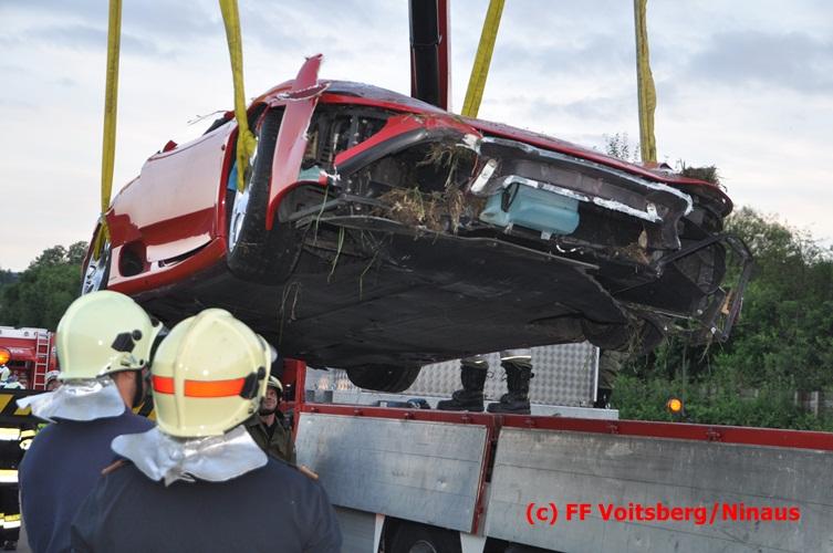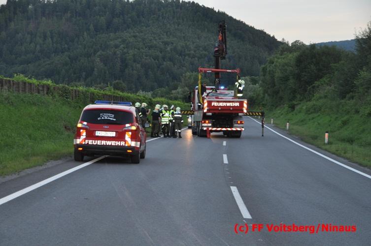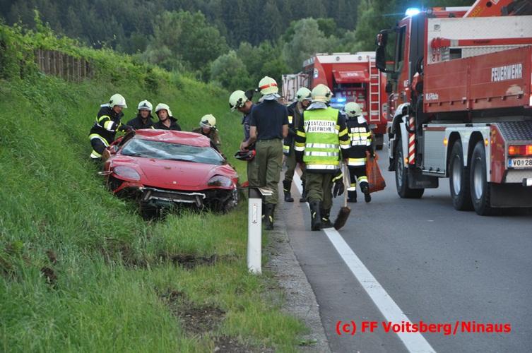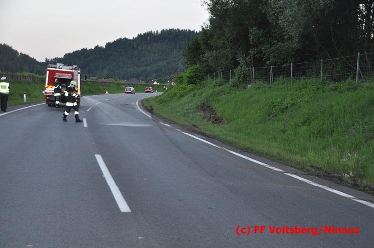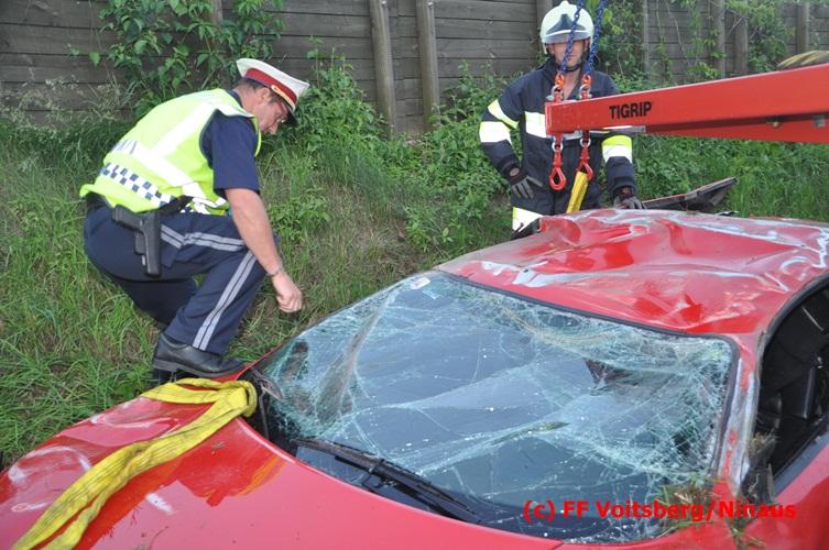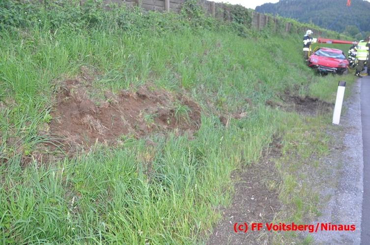 VOITSBERG, am 10.06.2016 Vermutlich wegen überhöhter Geschwindigkeit kam ein PKW auf der LB 70 im Gemeindegebiet Krottendorf in Fahrtrichtung Graz ins Schleudern, geriet auf die rechte Straßenböschung, überschlug sich und schlitterte am Dach ca. 90 Meter auf die linke Straßenseite. Danach stürzte das schwer beschädigte Fahrzeug auf die Straßenböschung und kam neben dem linken Straßenrand zu stehen. Die Wegstrecke, an der sich der Unfall ereignete, wurde seitens der Polizei mit ca. 200 Meter angegeben. Der Lenker und ein Beifahrer hatten riesiges Glück und konnten leicht verletzt aus dem Sportwagen aussteigen, wurden vom Roten Kreuz Voitsberg erstversorgt und danach ins LKH Voitsberg eingeliefert. Das Unfallwrack wurde mit dem WLF-Kran der FF Voitsberg geborgen und von der Unfallstelle entfernt. Ausgelaufene Betriebsmittel wurden seitens der FF Gaisfeld gebunden und fachgerecht entsorgt. Herumliegende Wrackteile wurden von der FF Krottendorf eingesammelt. Die Verkehrsregelung oblag den Wehren Gaisfeld und Krottendorf in Zusammenarbeit mit der Polizei. Man kann wiederum von großem Glück sprechen, dass zum Zeitpunkt des Unfalles auf der sonst sehr stark befahrenen Bundesstraße kein Gegenverkehr herrschte.