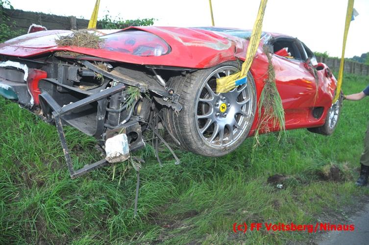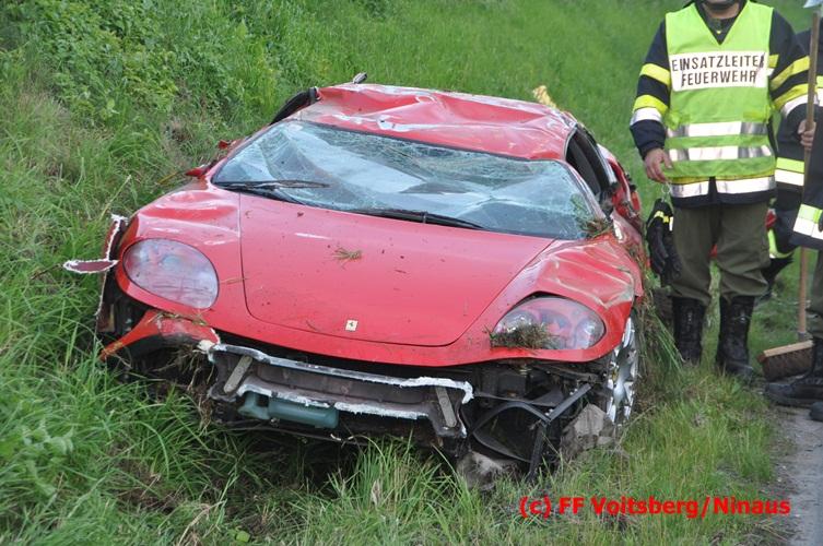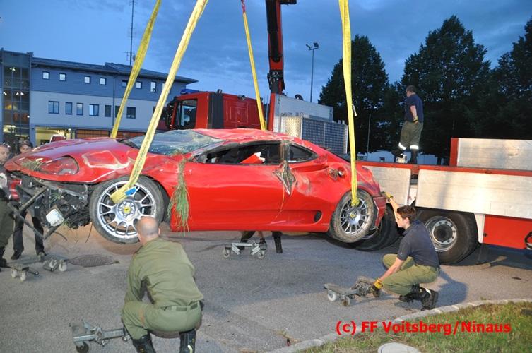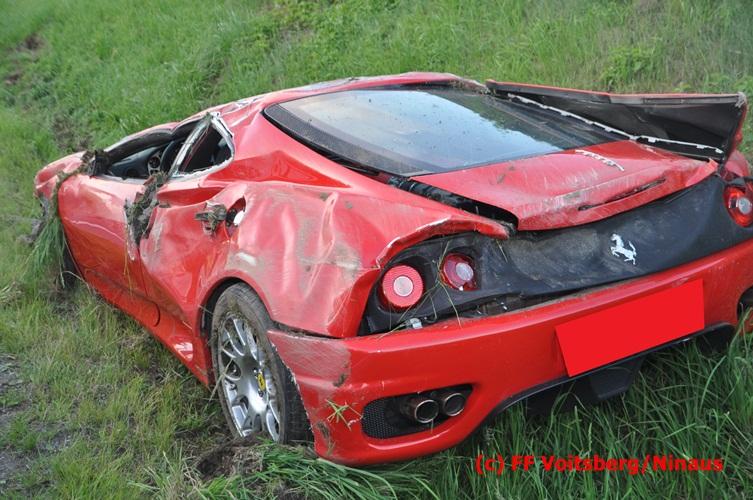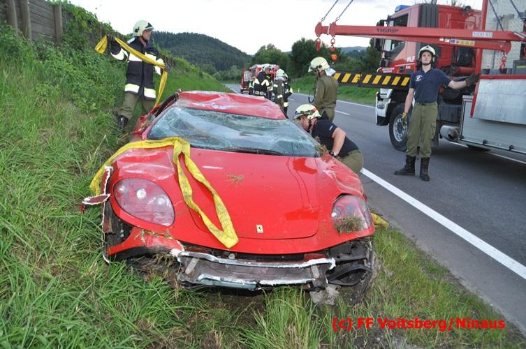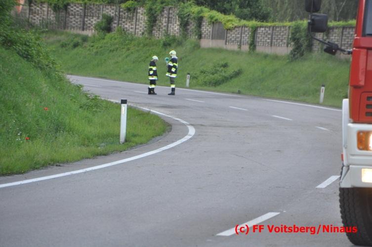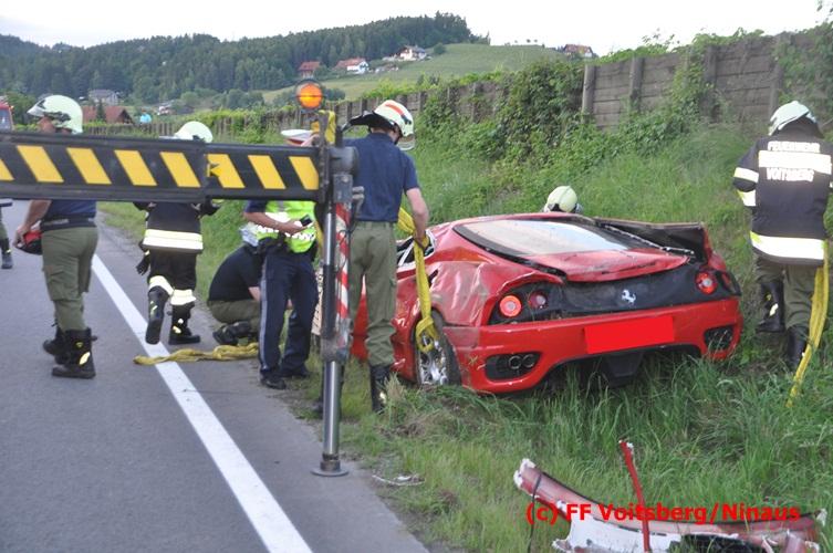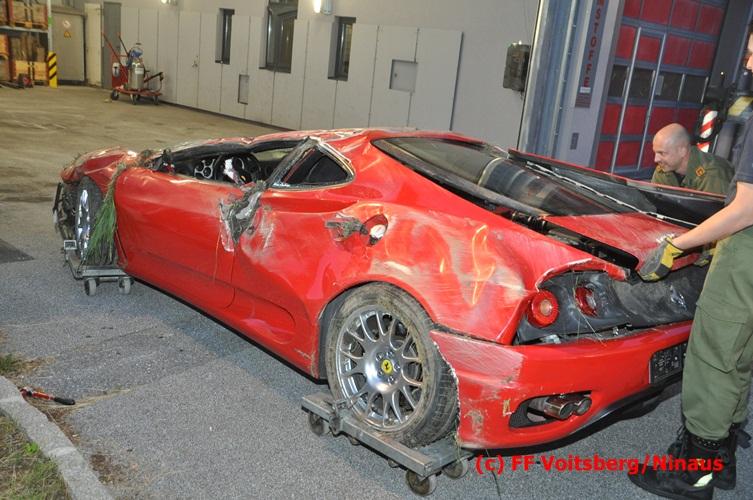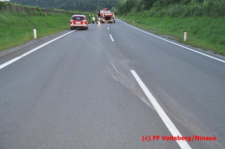 VOITSBERG, am 10.06.2016 Vermutlich wegen überhöhter Geschwindigkeit kam ein PKW auf der LB 70 im Gemeindegebiet Krottendorf in Fahrtrichtung Graz ins Schleudern, geriet auf die rechte Straßenböschung, überschlug sich und schlitterte am Dach ca. 90 Meter auf die linke Straßenseite. Danach stürzte das schwer beschädigte Fahrzeug auf die Straßenböschung und kam neben dem linken Straßenrand zu stehen. Die Wegstrecke, an der sich der Unfall ereignete, wurde seitens der Polizei mit ca. 200 Meter angegeben. Der Lenker und ein Beifahrer hatten riesiges Glück und konnten leicht verletzt aus dem Sportwagen aussteigen, wurden vom Roten Kreuz Voitsberg erstversorgt und danach ins LKH Voitsberg eingeliefert. Das Unfallwrack wurde mit dem WLF-Kran der FF Voitsberg geborgen und von der Unfallstelle entfernt. Ausgelaufene Betriebsmittel wurden seitens der FF Gaisfeld gebunden und fachgerecht entsorgt. Herumliegende Wrackteile wurden von der FF Krottendorf eingesammelt. Die Verkehrsregelung oblag den Wehren Gaisfeld und Krottendorf in Zusammenarbeit mit der Polizei. Man kann wiederum von großem Glück sprechen, dass zum Zeitpunkt des Unfalles auf der sonst sehr stark befahrenen Bundesstraße kein Gegenverkehr herrschte.
