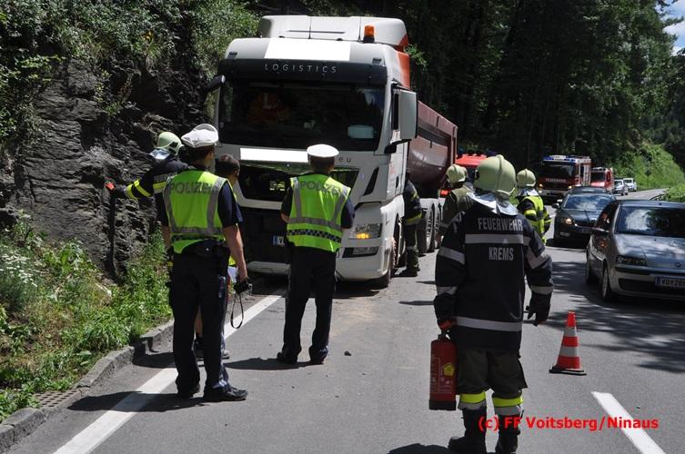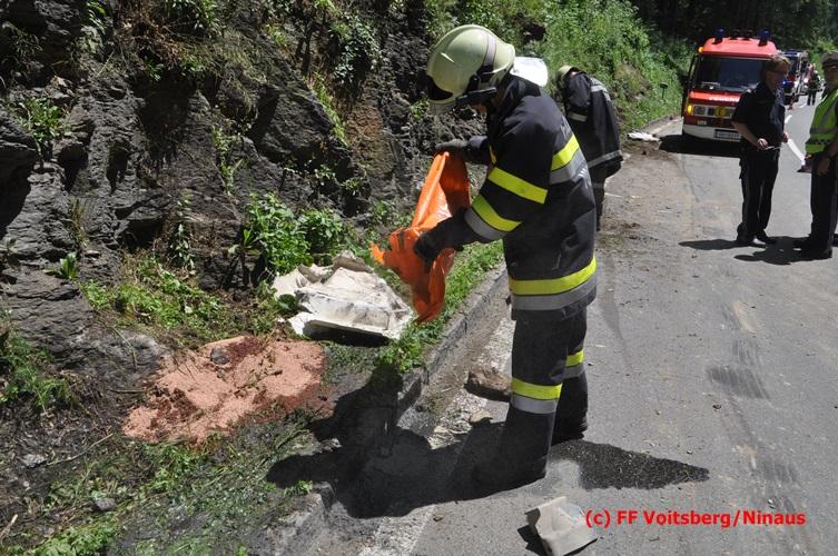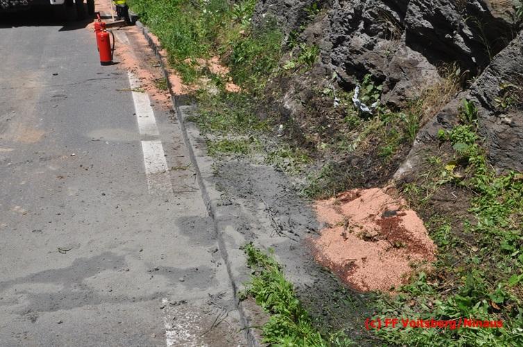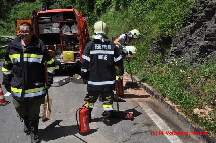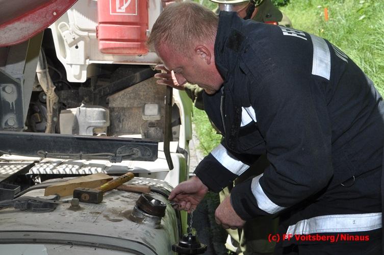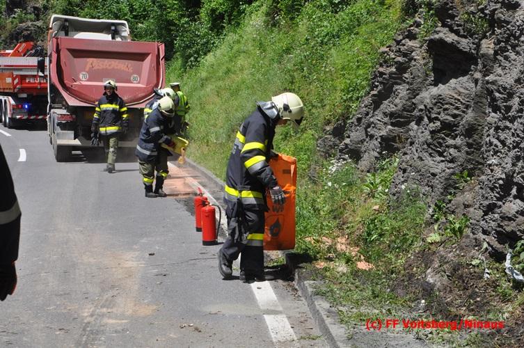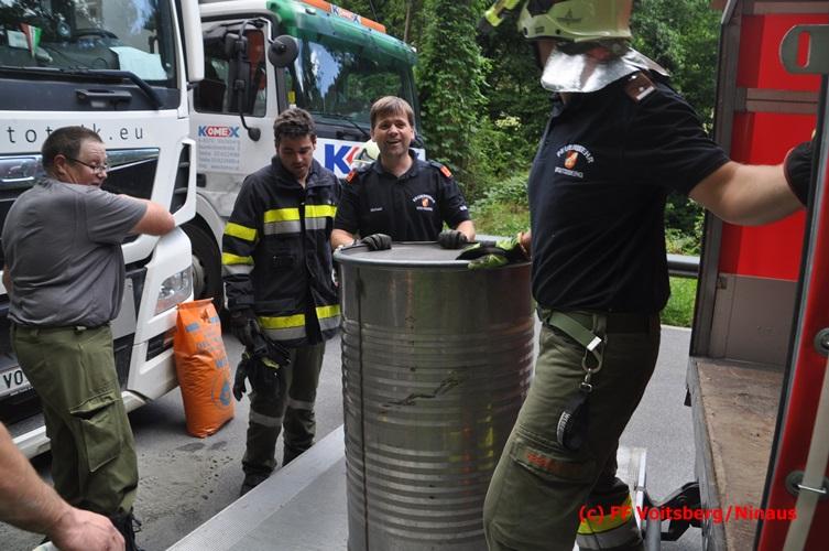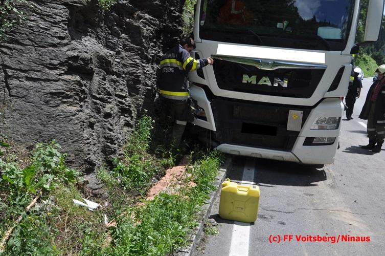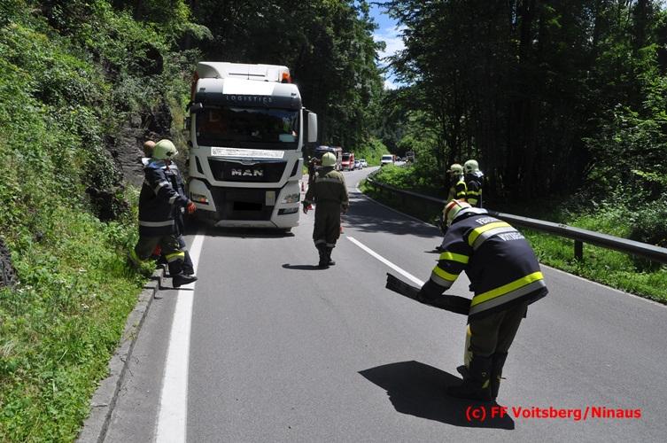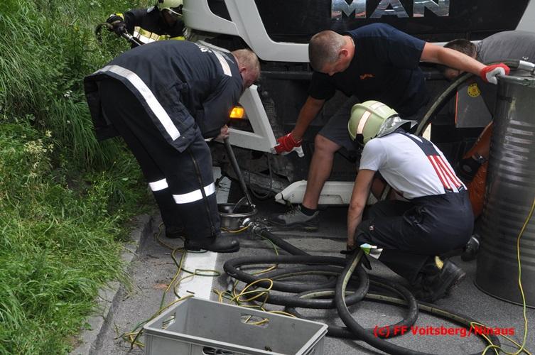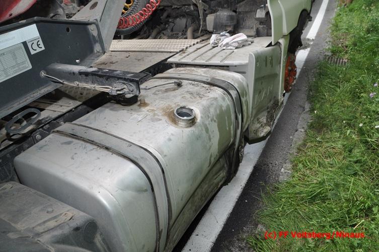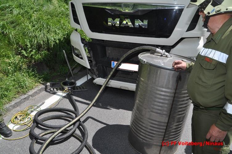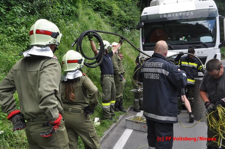 VOITSBERG, am 28.06.2016 Ein Sattelschlepper kam am Dienstag, 28.6.2016 kurz nach 13:00 Uhr aus ungeklärter Ursache auf das Bankett der LB 70 in den Kremser Reihen in Fahrtrichtung Voitsberg, touchierte einige Felsen und schlitterte ca. 70 m entlang einer Böschung auf der rechten Fahrbahnhälfte. Dabei wurde sein rechter Treibstofftank aufgerissen, wobei Treibstoff auf die Fahrbahn gelangte. Drei Reifen wurden beim LKW aufgeschlitzt. Die alarmierte FF Krems führte bis zum Eintreffen der Ölstutzpunktfeuerwehr Voitsberg Erstmaßnahmen durch, sicherte die Unfallstelle ab, band einen Teil der ausgeflossenen Betriebsmittel und reinigte die Straße. Die KameradInnen der FF Voitsberg pumpten den restlichen Treibstoff mittels Vakuumpumpe in ein Fass, restliche ausgeflossene Betriebsmittel wurden gebunden und fachgerecht entsorgt. Die Polizei führte die Erhebungen durch und die Straßenmeisterei Voitsberg hob oberflächlich getränktes Erdreich ab und entsorgte dieses fachgerecht. Die Bergung des LKW erfolgte durch eine Fachfirma. Die LB 70 war während der Arbeiten nur einspurig befahrbar. Eingesetzt waren insgesamt 16 KameradInnen mit 5 Fahrzeugen, 5 Polizeibeamte und 4 Mann der Straßenmeisterei.