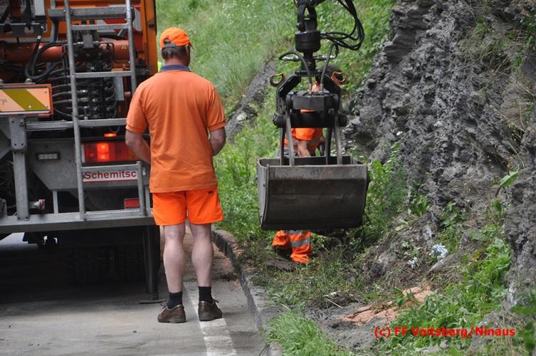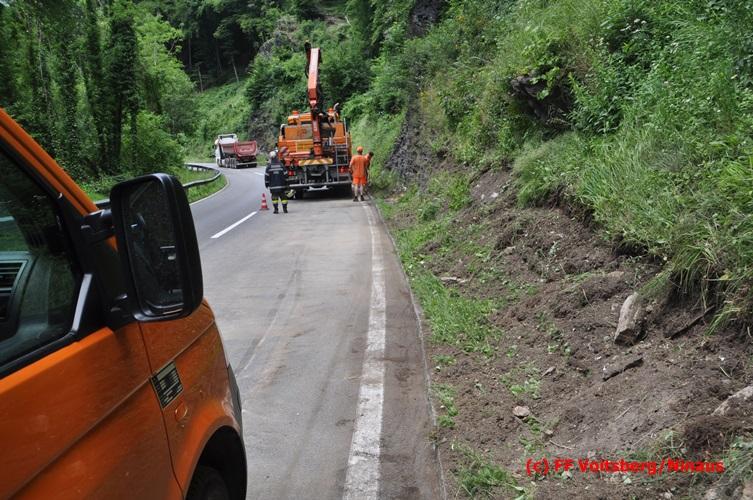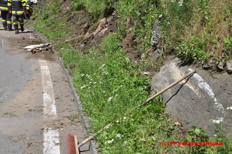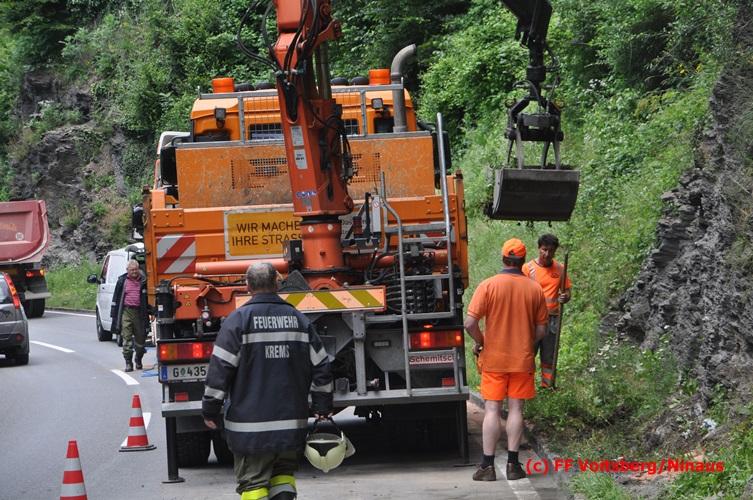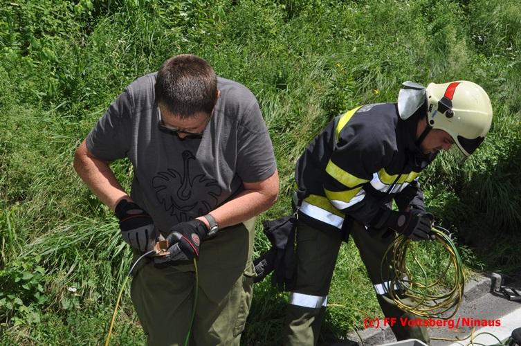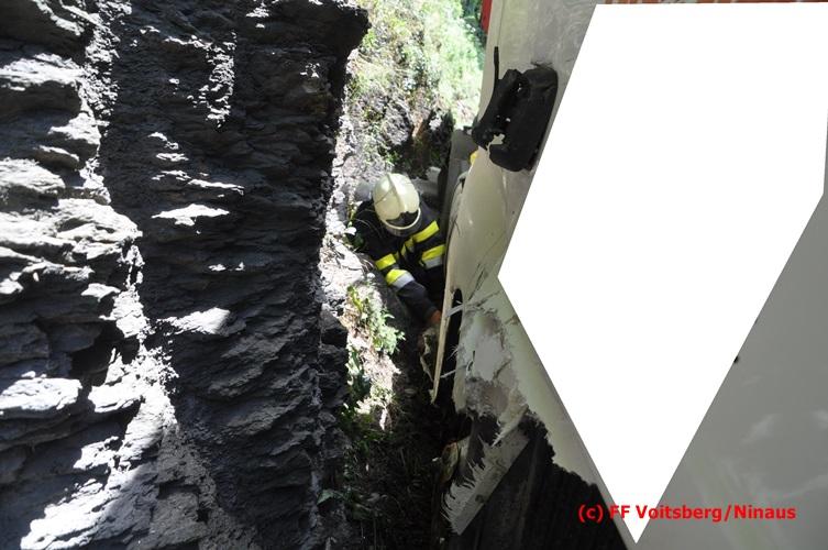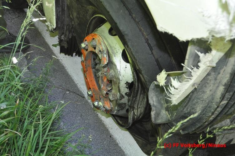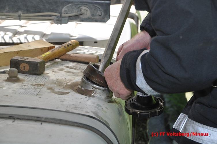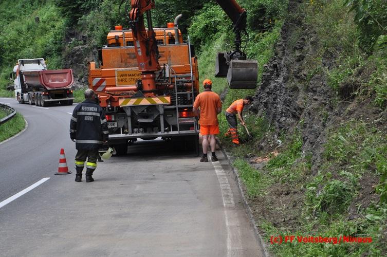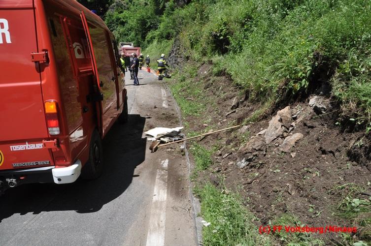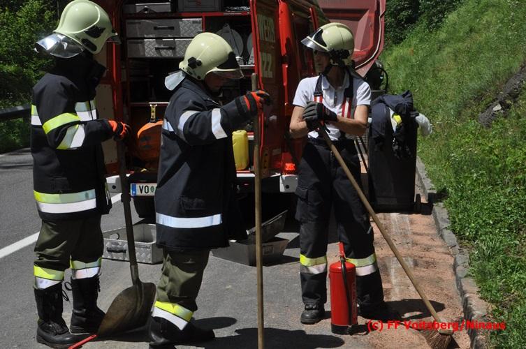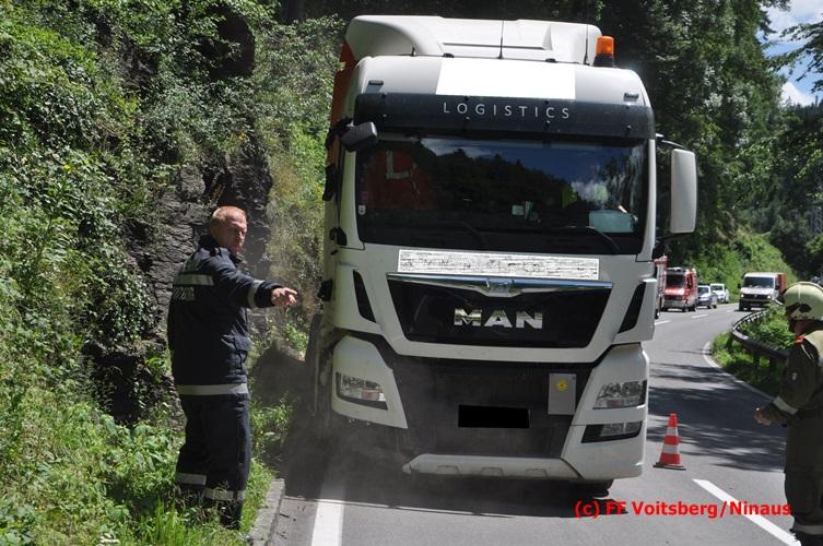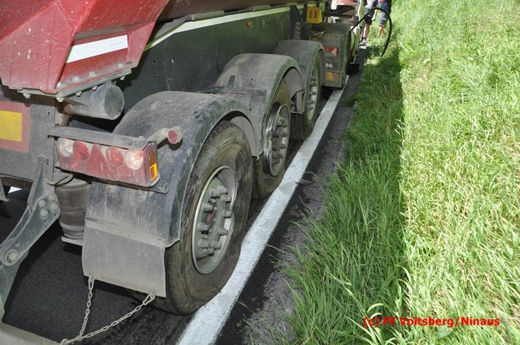 VOITSBERG, am 28.06.2016 Ein Sattelschlepper kam am Dienstag, 28.6.2016 kurz nach 13:00 Uhr aus ungeklärter Ursache auf das Bankett der LB 70 in den Kremser Reihen in Fahrtrichtung Voitsberg, touchierte einige Felsen und schlitterte ca. 70 m entlang einer Böschung auf der rechten Fahrbahnhälfte. Dabei wurde sein rechter Treibstofftank aufgerissen, wobei Treibstoff auf die Fahrbahn gelangte. Drei Reifen wurden beim LKW aufgeschlitzt. Die alarmierte FF Krems führte bis zum Eintreffen der Ölstutzpunktfeuerwehr Voitsberg Erstmaßnahmen durch, sicherte die Unfallstelle ab, band einen Teil der ausgeflossenen Betriebsmittel und reinigte die Straße. Die KameradInnen der FF Voitsberg pumpten den restlichen Treibstoff mittels Vakuumpumpe in ein Fass, restliche ausgeflossene Betriebsmittel wurden gebunden und fachgerecht entsorgt. Die Polizei führte die Erhebungen durch und die Straßenmeisterei Voitsberg hob oberflächlich getränktes Erdreich ab und entsorgte dieses fachgerecht. Die Bergung des LKW erfolgte durch eine Fachfirma. Die LB 70 war während der Arbeiten nur einspurig befahrbar. Eingesetzt waren insgesamt 16 KameradInnen mit 5 Fahrzeugen, 5 Polizeibeamte und 4 Mann der Straßenmeisterei.