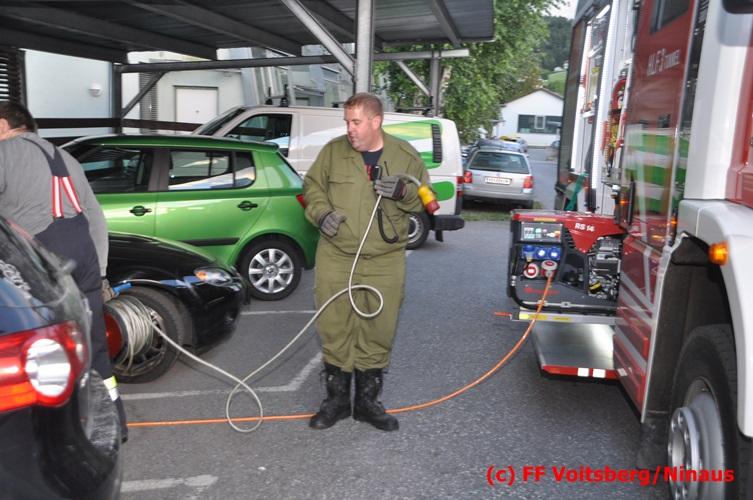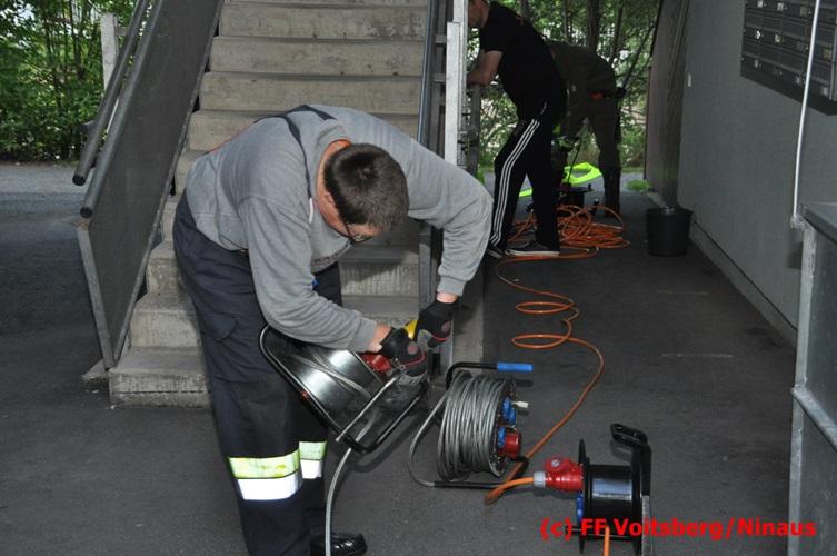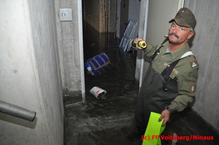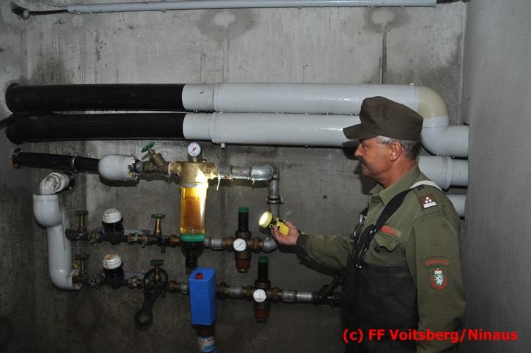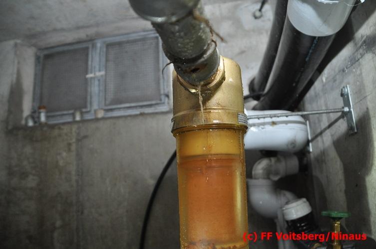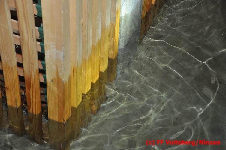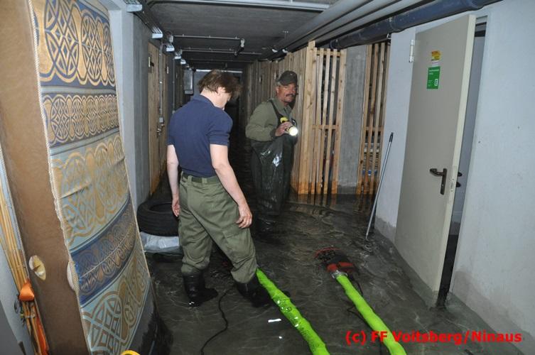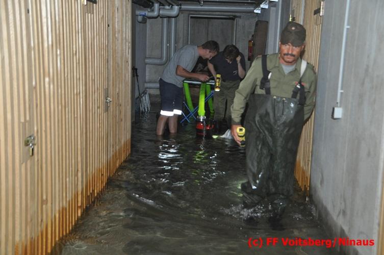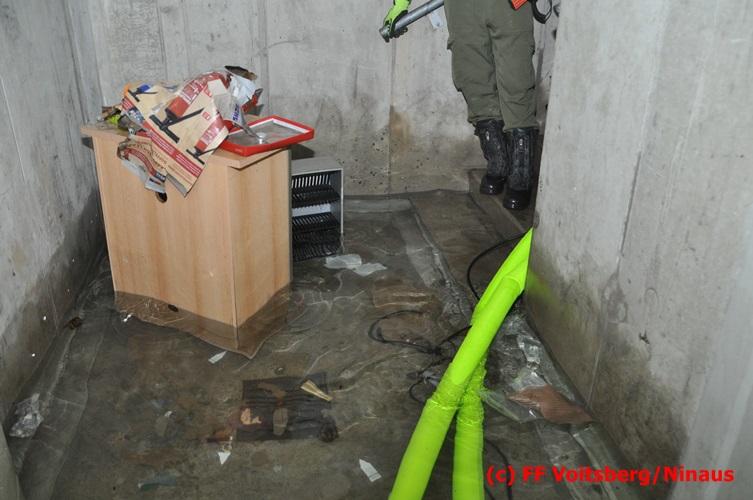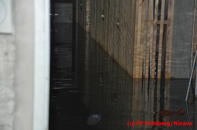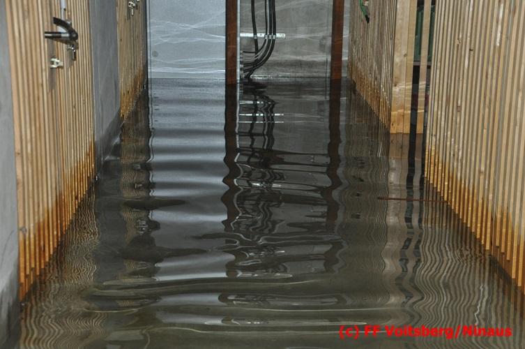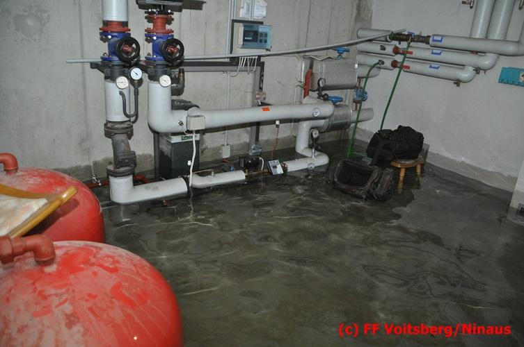 VOITSBERG, am 14.07.2016 Nach einem Wasserrohrbruch in einem Mehrfamilienwohnhaus wurde der Keller im Ausmaß von ca. 400 m2 auf einer Höhe von bis zu 40 cm überschwemmt. Die FF Voitsberg pumpte unter Einsatz von drei Elektro-Tauchpumpen. eines Nasssaugers und unter Verwendung des am HLF 3 installierten Stromgenerators die ca. 150.000 Liter Wasser aus dem Keller. Großer Schaden entstand bei im Keller gelagerten Gegenständen. Durch den hohen Wasserstand war auch die Fernwärmeanlage betroffen. Die Reparatur des defekten Rohres wurde noch in der Nacht von einem Fachunternehmen durchgeführt. 7 KameradInnen konnten nach einem über dreistündigen Einsatz die Kellerräume im fast trockenen Zustand wieder verlassen und einrücken.