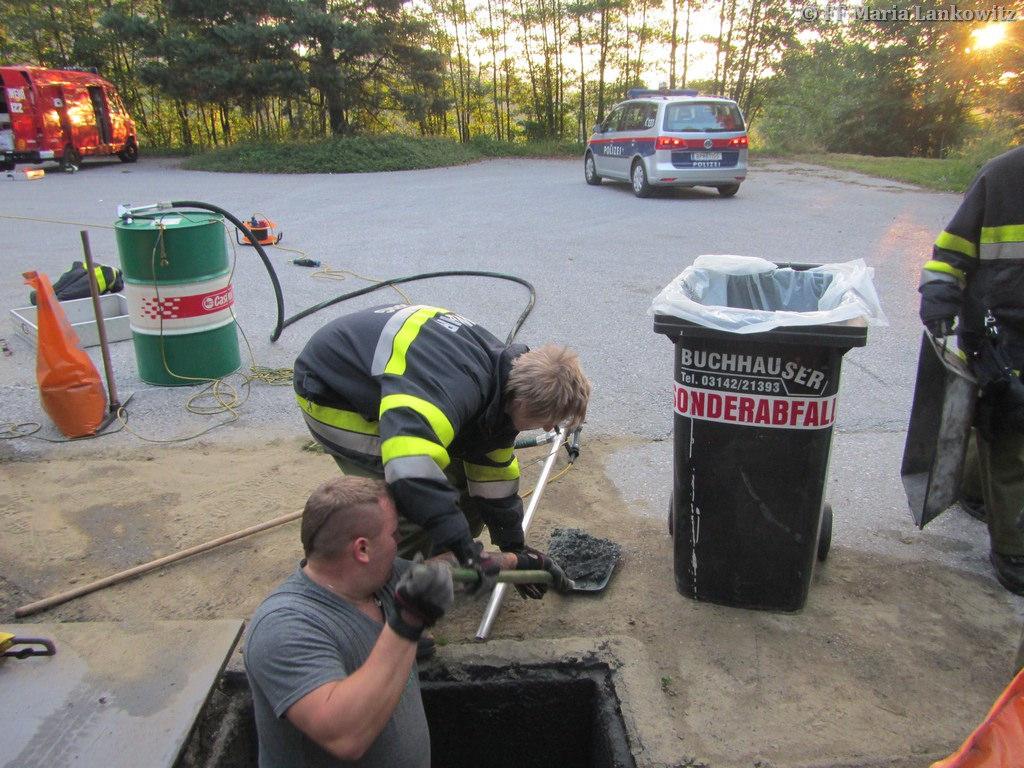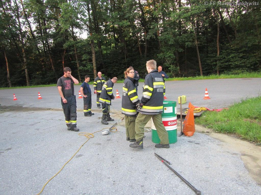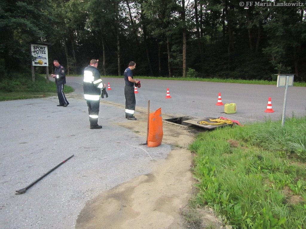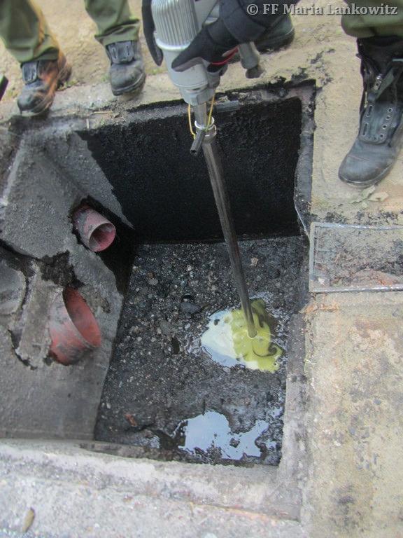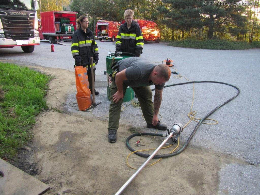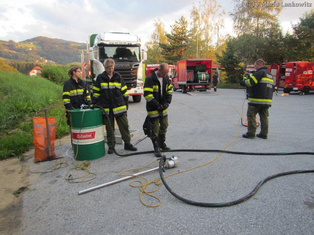 VOITSBERG, am 19.07.2016 Die FF Maria Lankowitz wurde zu einem Schadstoffeinsatz alarmiert. Aus dem Treibstofftank eines abgestellten LKW waren 500 l Diesel ausgelaufen. Das Dieselöl hatte sich auf dem Parkplatz verteilt, war in einen Regenwasserschacht sowie in das angrenzende Erdreich eingedrungen. Einsatzleiter HBI Peter Jandl ließ nach der Erkundung sofort das Ölschadensfahrzeug der FF Voitsberg nachalarmieren. Gemeinsam mit den Voitsberger Florianis wurde das Öl gebunden sowie der Kanalschacht ausgepumpt. Weiters wurde der Chemiealarmdienst Land Steiermark alarmiert. Das kontaminierte Erdreich wurde von einer Fachfirma abgegraben und der Entsorgung zugeführt. (Bericht von BFV - Homepage)