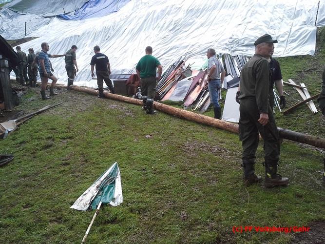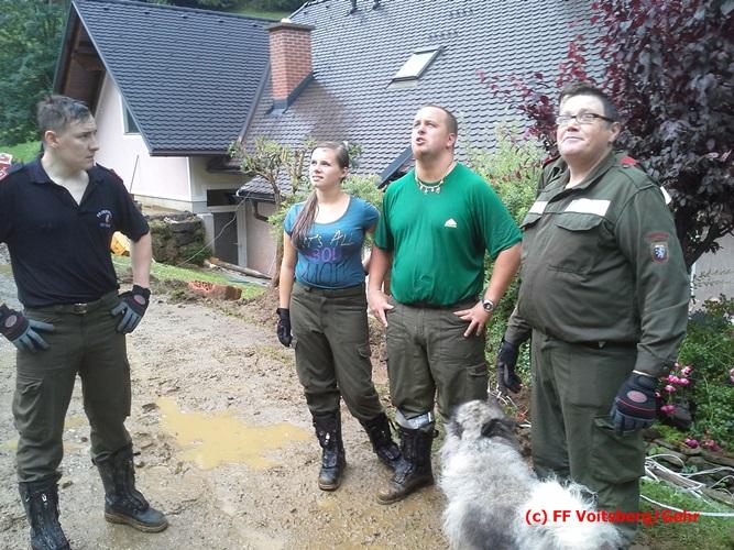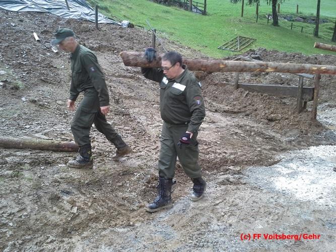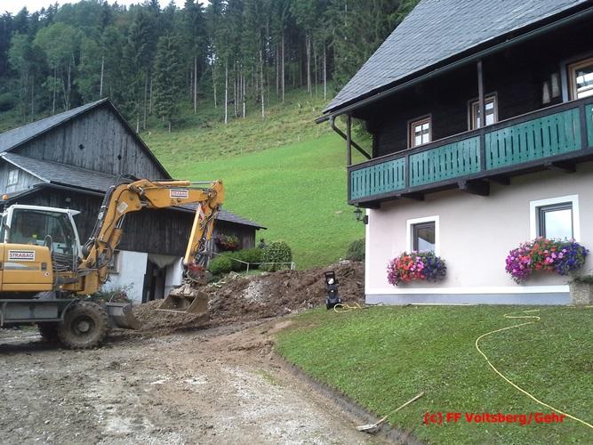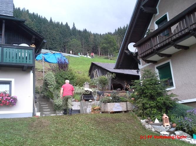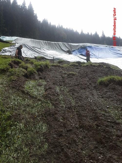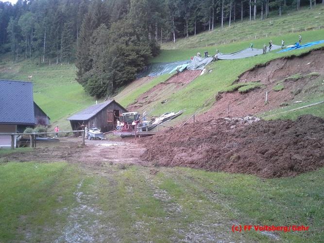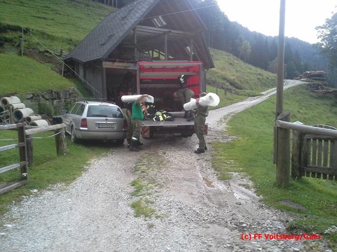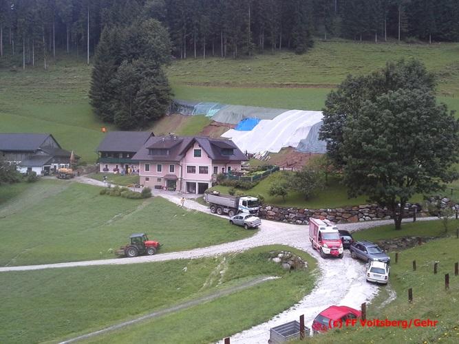 VOITSBERG, am 25.07.2016 Heftige Unwetter im Gemeindegebiet Kainach erforderten bereits seit Mitternacht den Einsatz der FF Kainach. Nach einer Hangrutschung im Bereich Gallmannsegg war ein landwirtschaftliches Anwesen gefährdet. Ein Wirtschaftsgebäude wurde bereits durch Erdmassen verschoben. Die FF Kainach forderte zur Unterstützung die FF Bärnbach, FF Afling und die FF Voitsberg an. Die FF Voitsberg rückte mit KRF – B und VF mit Abdeckplanen und 9 Mann / Frau zur Unterstützung der FF Kainach aus. Unter der Einsatzleitung von HBI DI Wolfgang Scherz und ABI Alfred Jauk wurde mit Planen der offene Hang abgedeckt um ein weiteres Eindringen von Regenwasser zu verhindern und die Rutschung zu stoppen.