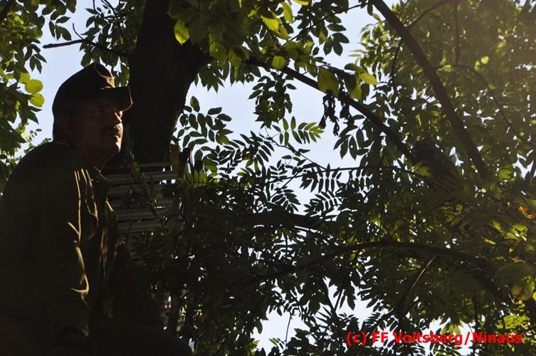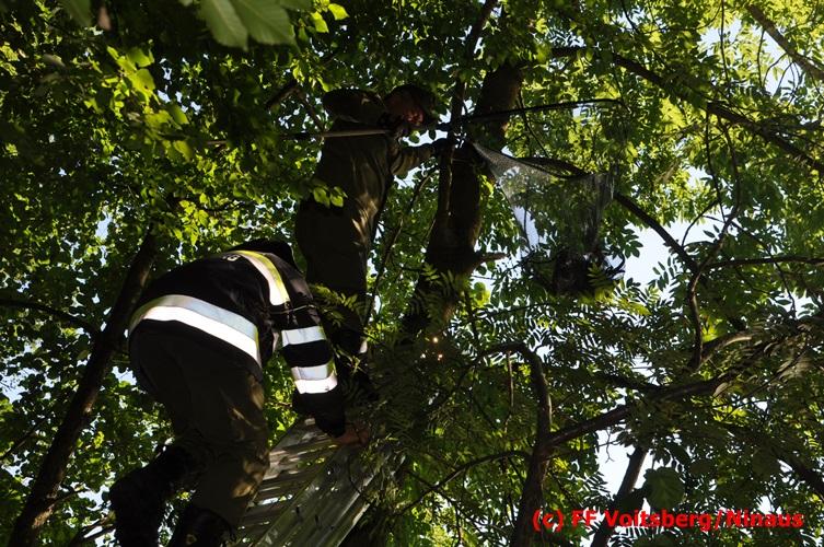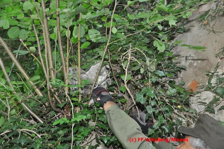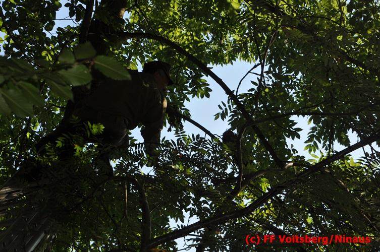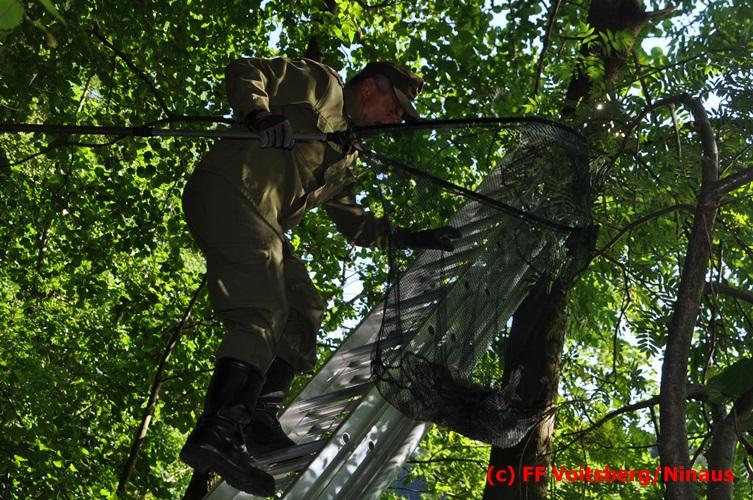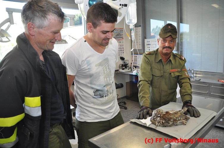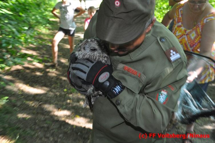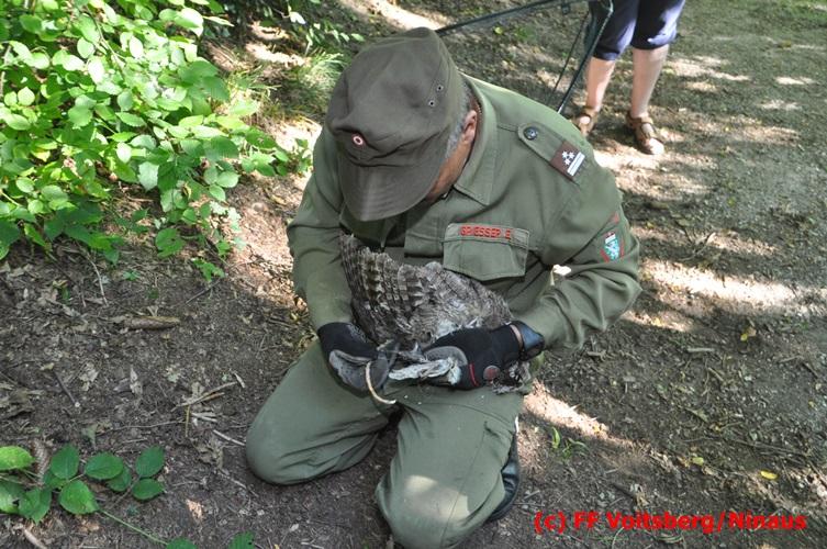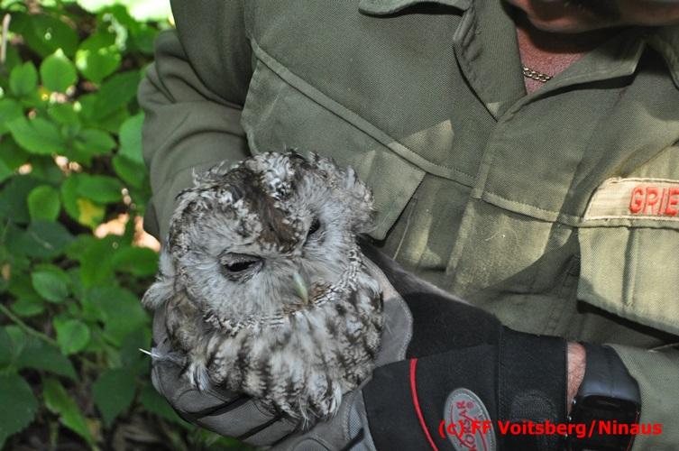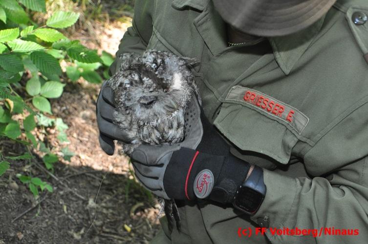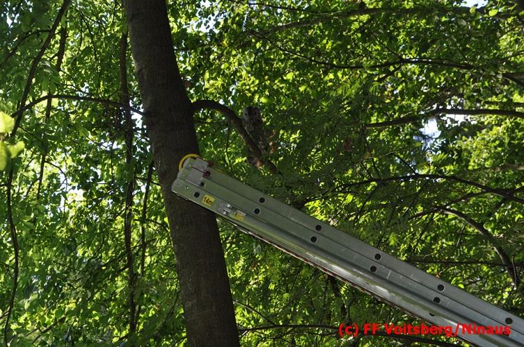 VOITSBERG, am 29.07.2016 Spaziergänger bemerkten im Naherholungsgebiet Grafenteich in Voitsberg einen auf einer Höhe von ca. 5 Meter sitzenden Waldkauz. Durch Bewegungen und Zurufen versuchten sie das Tier zum Wegfliegen zu bringen. Dabei bemerkten sie, dass der Vogel sich mit seinen Läufen an einer Fischerschnur verhakt hatte und damit flugunfähig war. Über die LLZ wurde die FF Voitsberg zur Rettung des Tieres alarmiert. Nach Erkundung durch den Einsatzleiter wurde der Kauz über eine Schiebeleiter unter Zuhilfenahme eines von einem Fischer ausgeliehenen Cacher geborgen und in die Tierklinik nach Rosental eingeliefert. Nach der Erstversorgung wurde das Tier zur Beobachtung in der Klinik belassen.