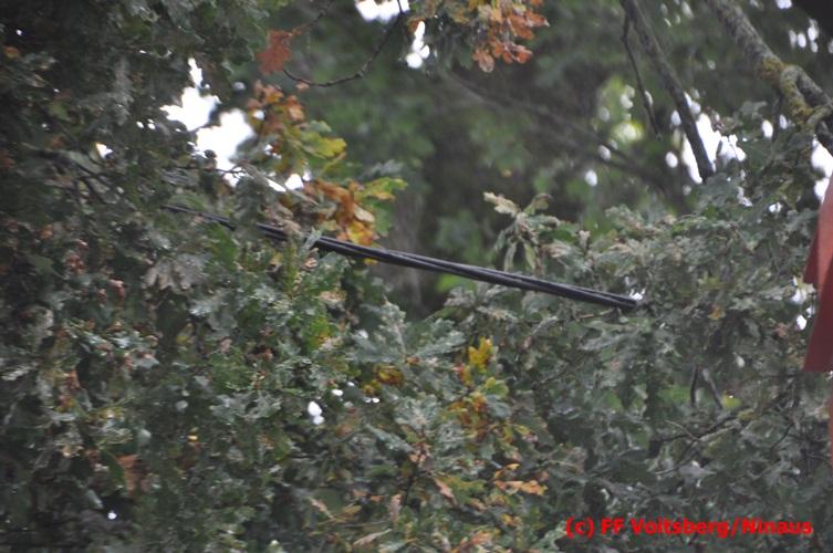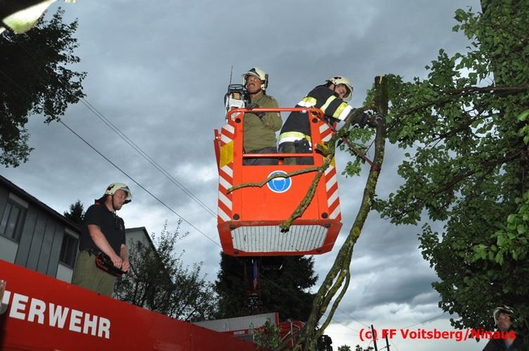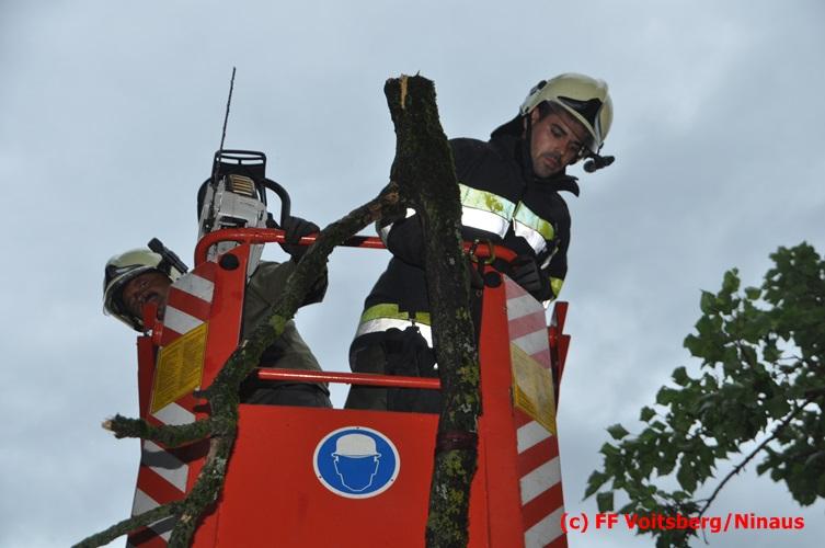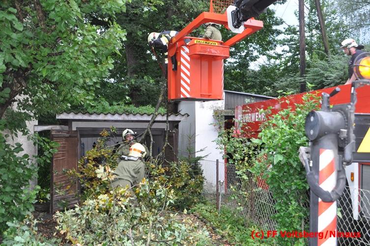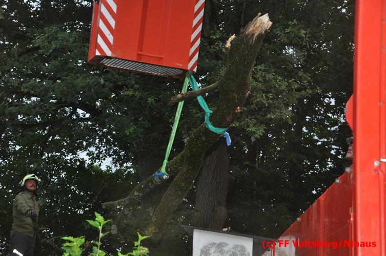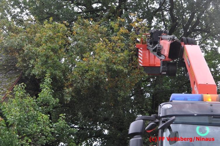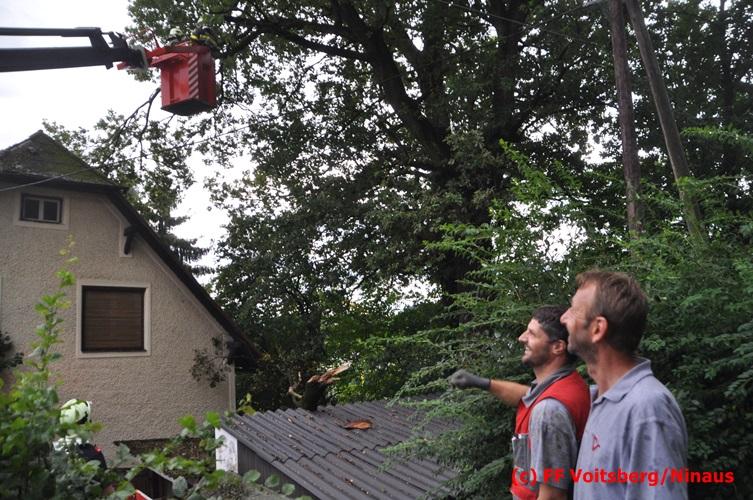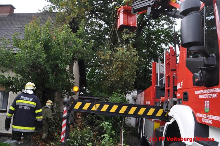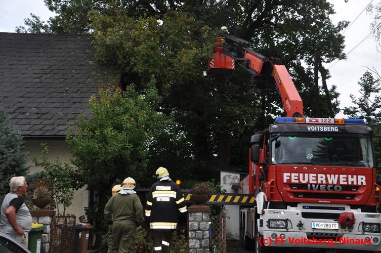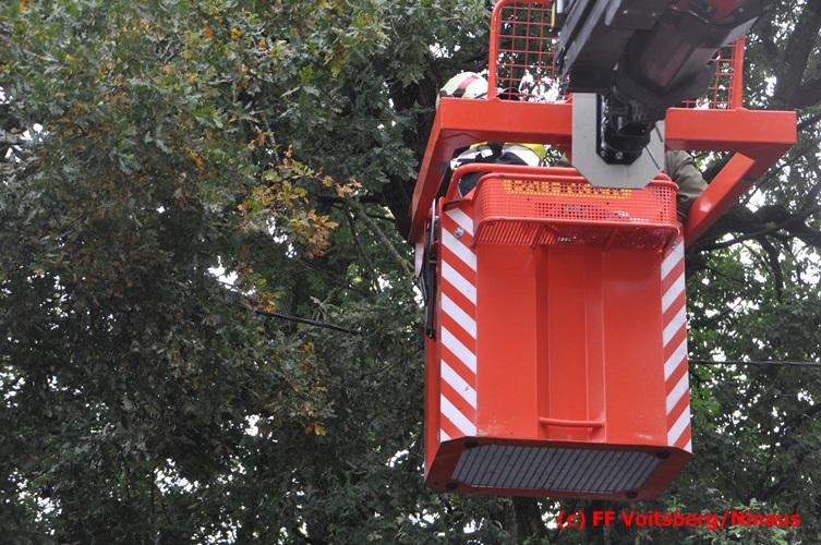 VOITSBERG, am 05.08.2016 Nach einem Sturm fielen Baumteile und Äste auf die Stromleitung eines Wohnhauses. Es bestand Gefahr in Verzug, da sich weitere Baumteile anstellten, abzubrechen. Ein Zutritt zum Grundstück war deshalb sehr gefährlich und nicht verantwortbar, sodass Kameraden mit Hilfe des WLF-Korbes den fast 100 Jahre alten Baum von den morschen Ästen befreiten. Der Inspektionsdienst der Stadtwerke Voitsberg musste während der Schneidearbeiten den Strom in diesem Gebiet für einige Stunden abschalten.