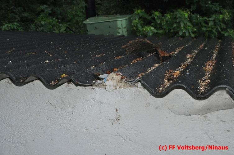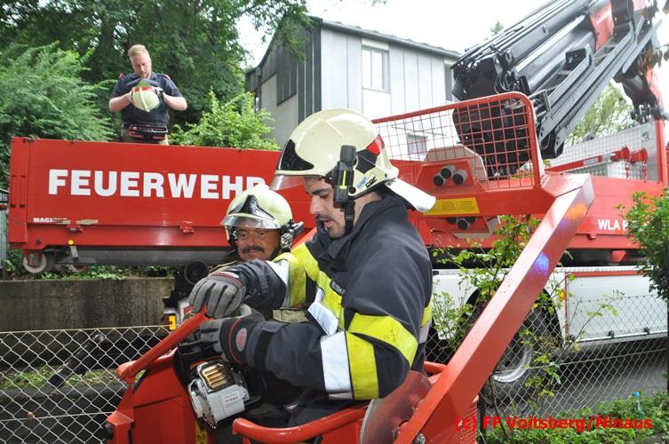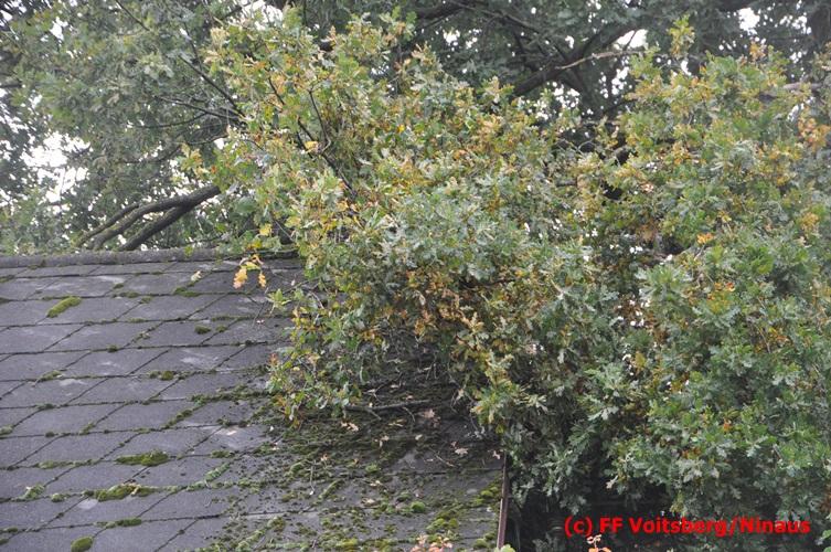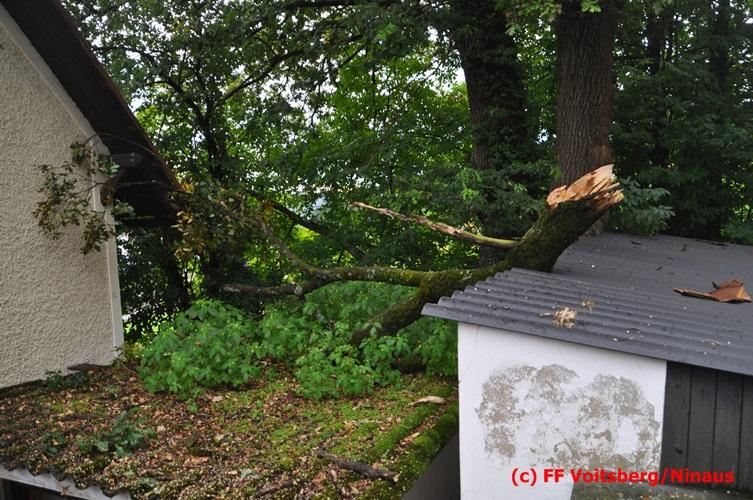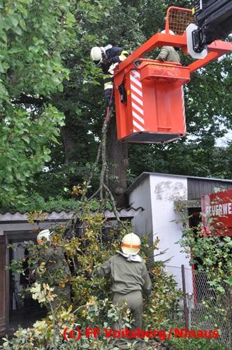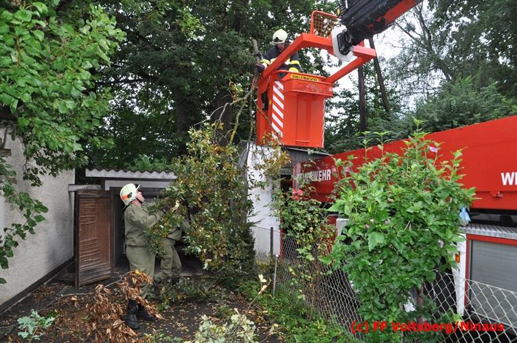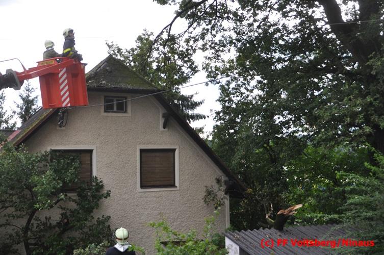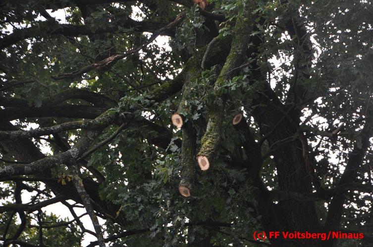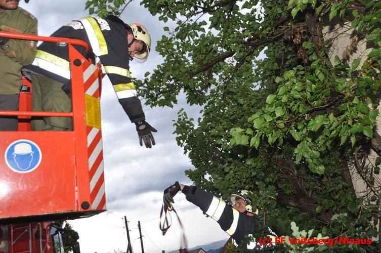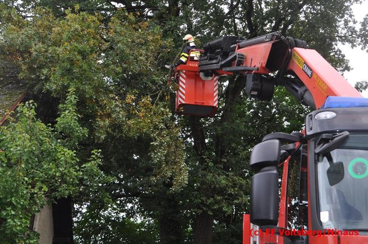 VOITSBERG, am 05.08.2016 Nach einem Sturm fielen Baumteile und Äste auf die Stromleitung eines Wohnhauses. Es bestand Gefahr in Verzug, da sich weitere Baumteile anstellten, abzubrechen. Ein Zutritt zum Grundstück war deshalb sehr gefährlich und nicht verantwortbar, sodass Kameraden mit Hilfe des WLF-Korbes den fast 100 Jahre alten Baum von den morschen Ästen befreiten. Der Inspektionsdienst der Stadtwerke Voitsberg musste während der Schneidearbeiten den Strom in diesem Gebiet für einige Stunden abschalten.