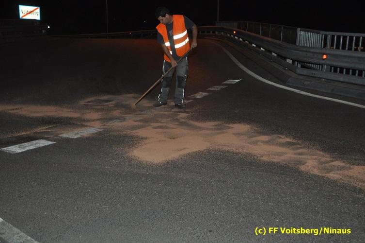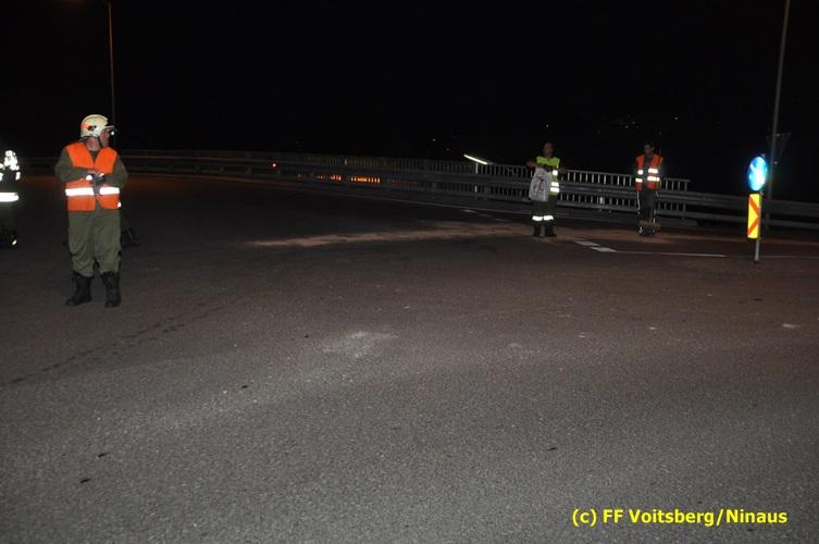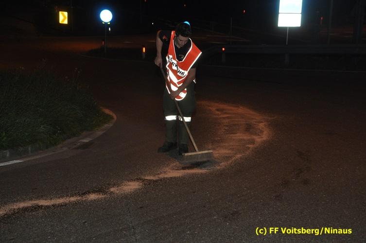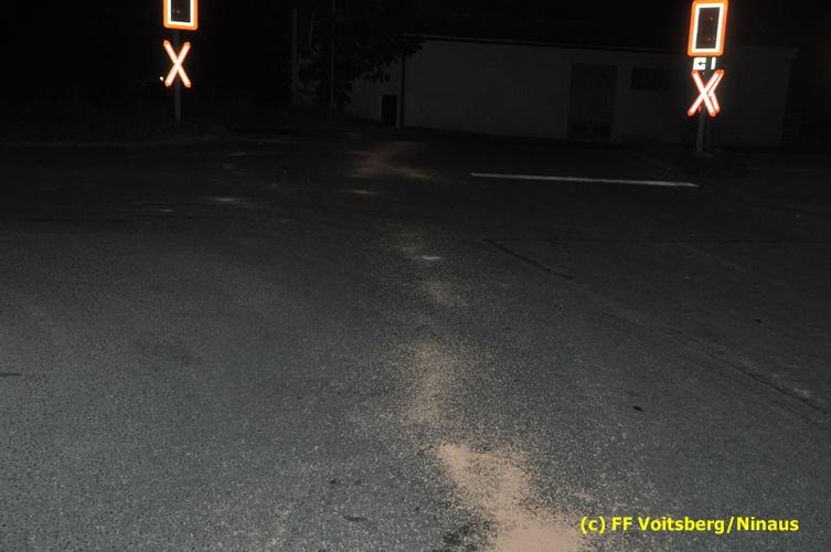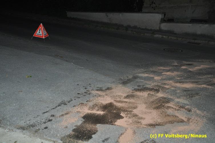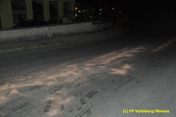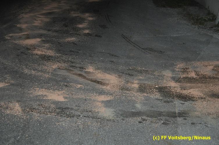 VOITSBERG, am 15.09.2016 Bei einem PKW eines Verkehrsteilnehmers gelangten Betriebsmittel auf die Gemeindestrasse. Die ca. 200 m lange Spur wurde mittels Ölbindemittel gebunden und fachgerecht entsorgt.