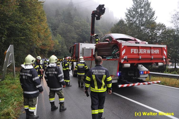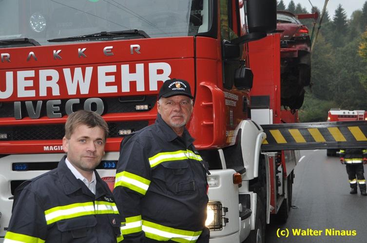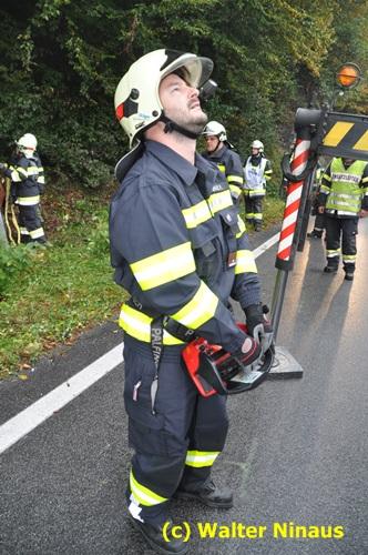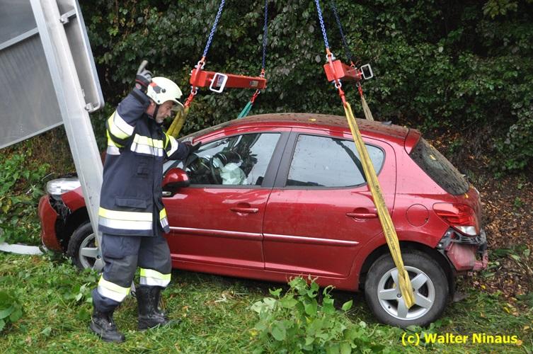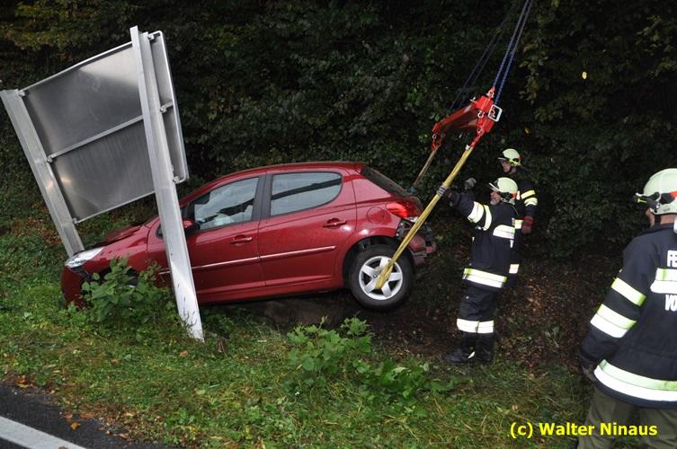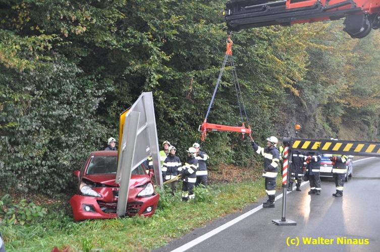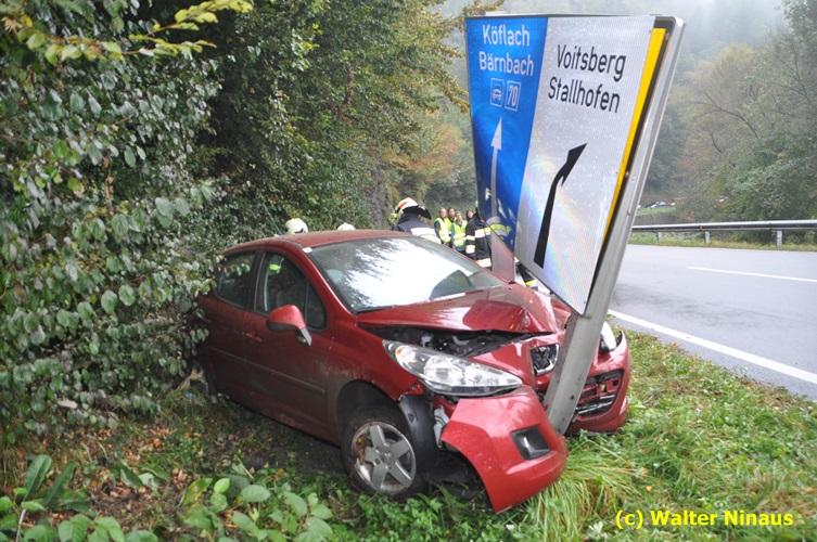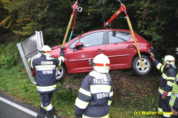 VOITSBERG, am 02.10.2016 In einer unfallträchtigen Kurve der LB 70 in den Kremser Reihen Fahrtrichtung Voitsberg geriet ein PKW von der Straße ab, prallte gegen einen Wegweiser und riss diesen aus seiner Verankerung. Das Fahrzeug verkeilte sich derart, dass der Einsatz des WLF-Kran erforderlich war. Das schwer beschädigte Fahrzeug wurde geborgen und von der Unfallstelle gebracht. Die einsatzleitende Feuerwehr Krems sicherte die Unfallstelle in Zusammenarbeit mit der Polizei ab und barg herumliegende Wrackteile des Fahrzeuges sowie Teile des Wegweisers.