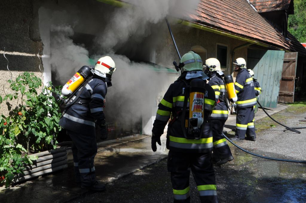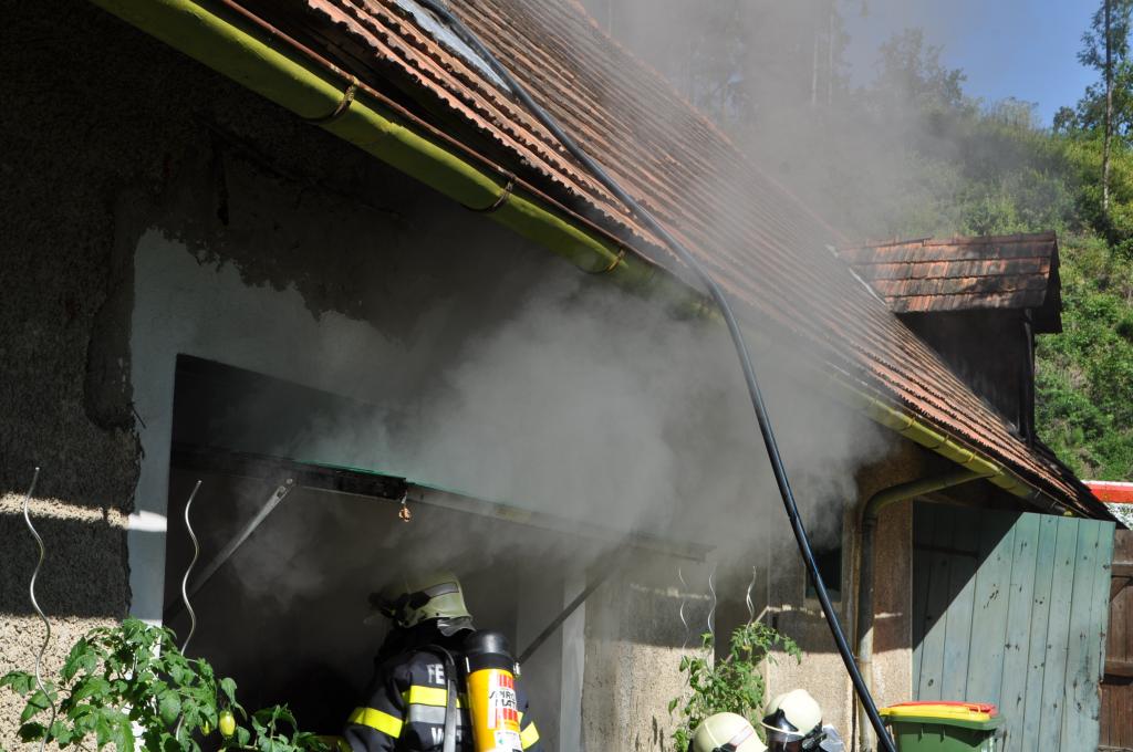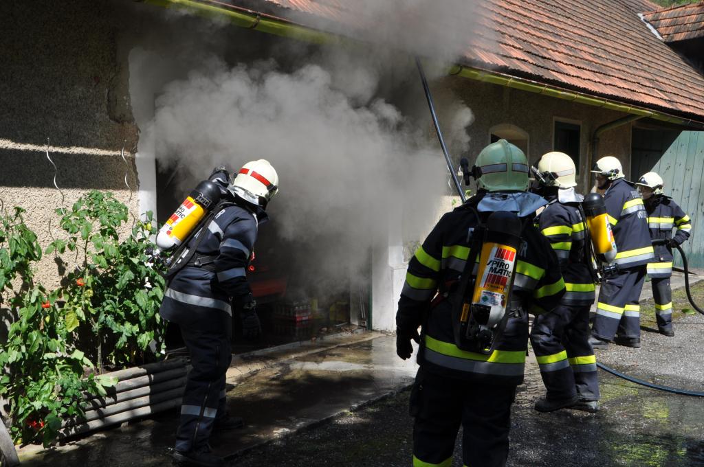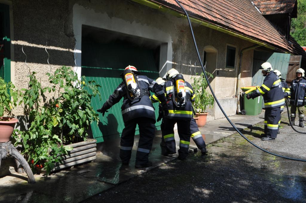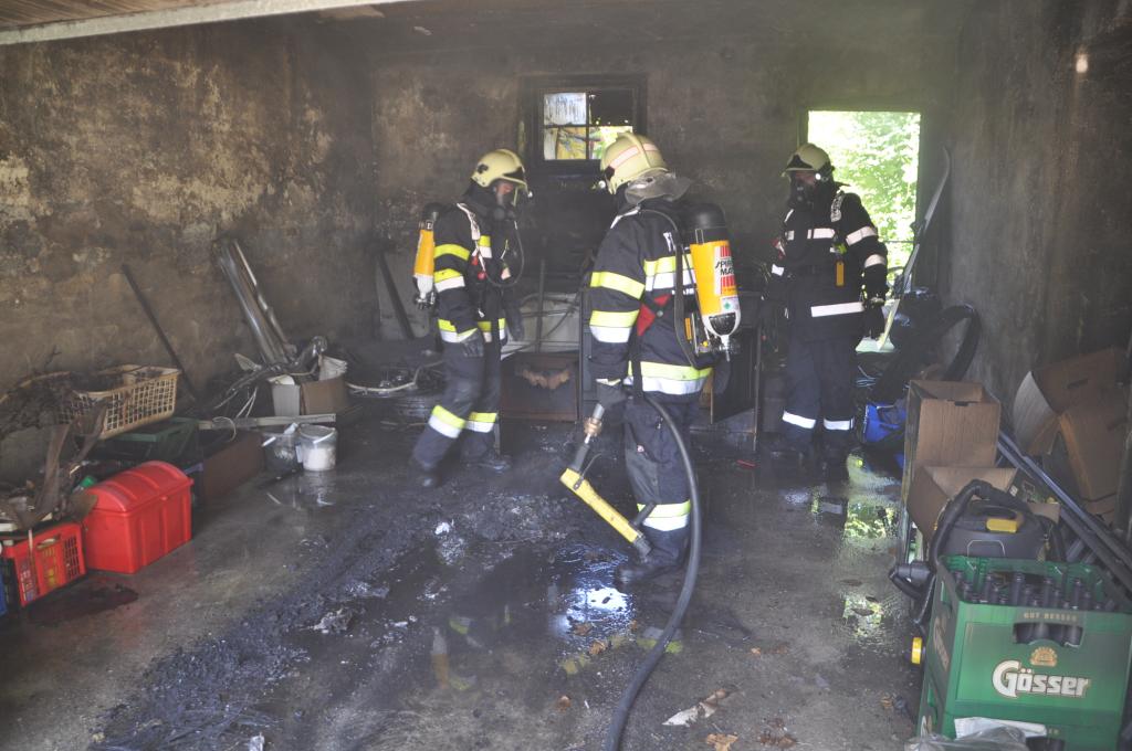 VOITSBERG, am 21.08.2014 Aus ungeklärter Ursache geriet ein PKW in einer verschlossenen Garage mit angebautem Wirtschaftsgebäude in Brand. Nachbarn bemerkten das Feuer und alarmierten die Einsatzkräfte, welche nach der Erkundung den hinteren Eingang gewaltsam öffneten, aber aufgrund der hohen Hitzeentwicklung nicht vordringen konnten. Deshalb wurde über dem vorderen Einfahrtstor ein Brandangriff unter schwerem Atemschutz durchgeführt. Der Brand war schnell unter Kontrolle. Das Wirtschaftsgebäude konnte durch den raschen Löscheinsatz gerettet werden. Das ausgebrannte Fahrzeug wurde mittels Seil geborgen. Im Freien wurde dann der Löscheinsatz abgeschlossen. Das Rote Kreuz Voitsberg war mit einem Team Vorort, wie auch die Polizei Voitsberg, welche die Erhebungen durchführte.