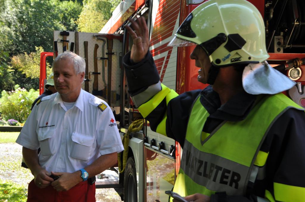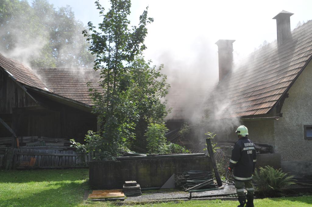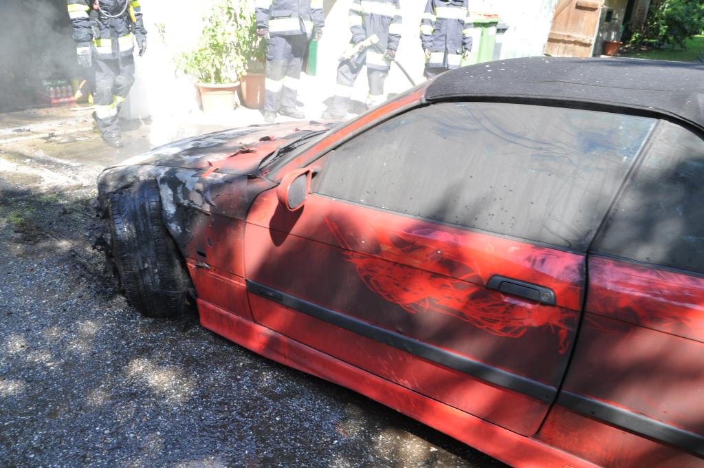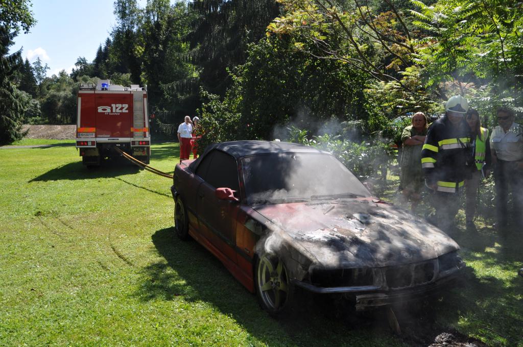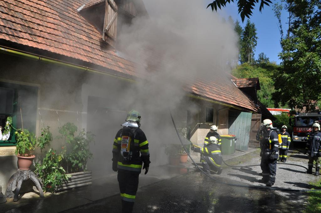 VOITSBERG, am 21.08.2014 Aus ungeklärter Ursache geriet ein PKW in einer verschlossenen Garage mit angebautem Wirtschaftsgebäude in Brand. Nachbarn bemerkten das Feuer und alarmierten die Einsatzkräfte, welche nach der Erkundung den hinteren Eingang gewaltsam öffneten, aber aufgrund der hohen Hitzeentwicklung nicht vordringen konnten. Deshalb wurde über dem vorderen Einfahrtstor ein Brandangriff unter schwerem Atemschutz durchgeführt. Der Brand war schnell unter Kontrolle. Das Wirtschaftsgebäude konnte durch den raschen Löscheinsatz gerettet werden. Das ausgebrannte Fahrzeug wurde mittels Seil geborgen. Im Freien wurde dann der Löscheinsatz abgeschlossen. Das Rote Kreuz Voitsberg war mit einem Team Vorort, wie auch die Polizei Voitsberg, welche die Erhebungen durchführte.